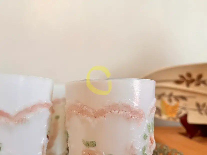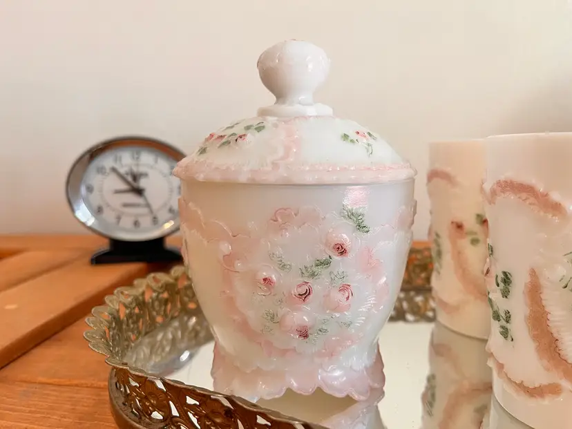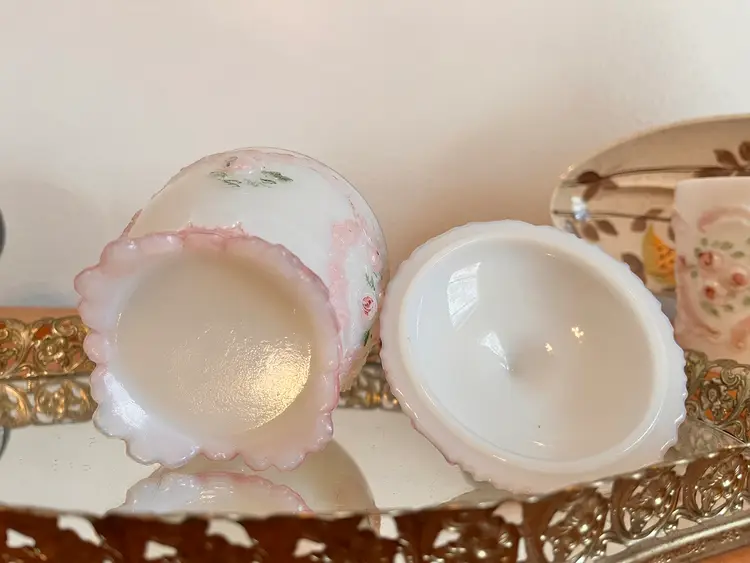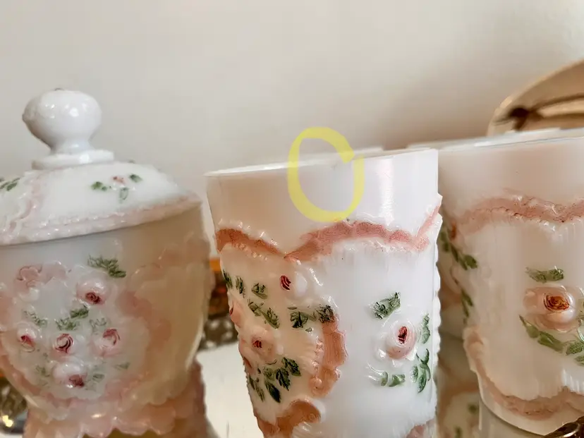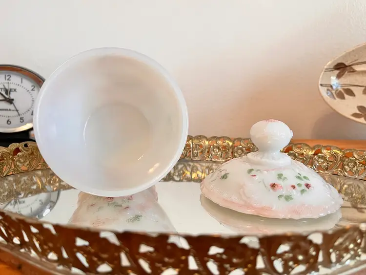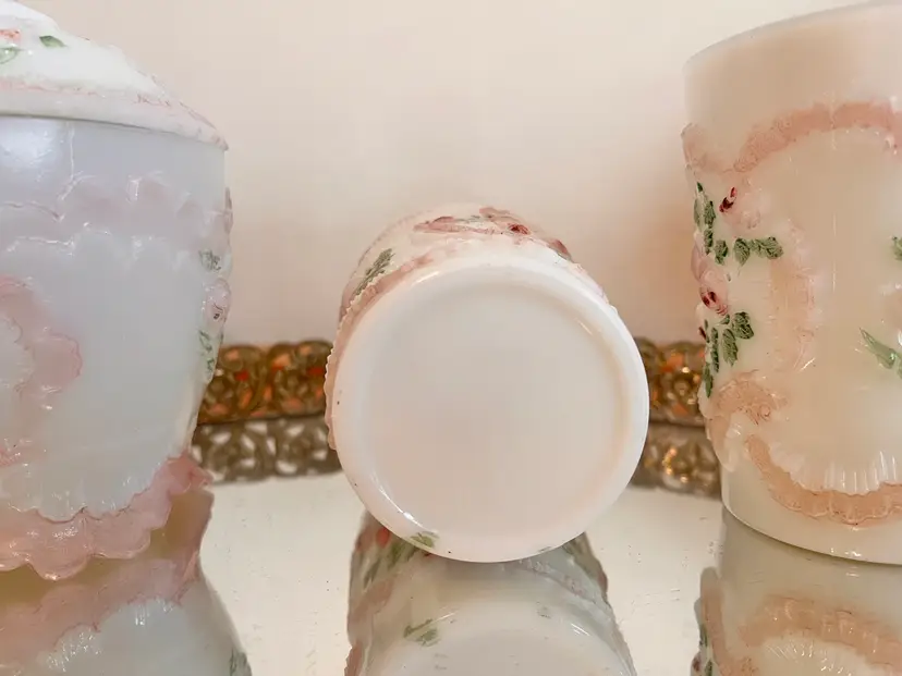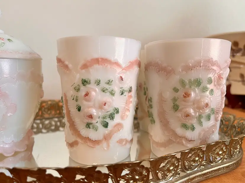 ANTIQUE!!! Circa 1901. This lovely set of antique milk glass dishes is great for use, or even for a display. Graciously given to me by my brother and sister in law, they had this piece proudly displayed next to their collection of Pyrex, Fenton, and even Imperial Glass. There is obvious wear to the paint on all four tumblers and the sugar dish; additionally, two of the four tumblers have one chip on their top rims (see pics for reference). Nevertheless, I find this set needing a new home.