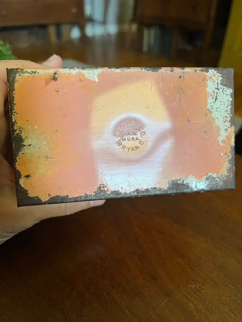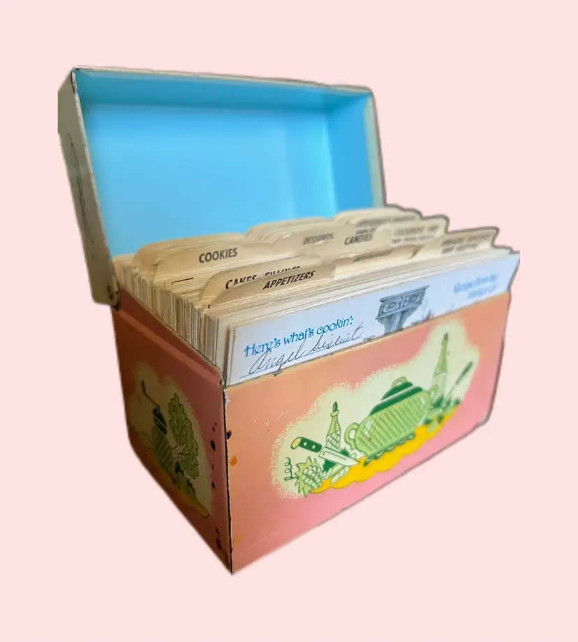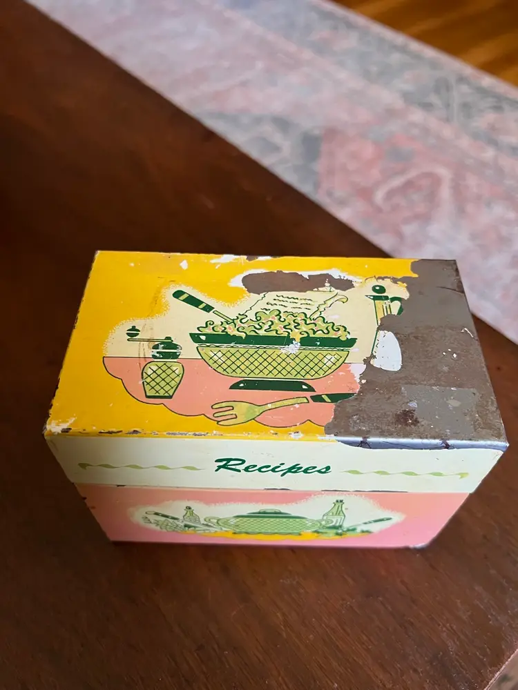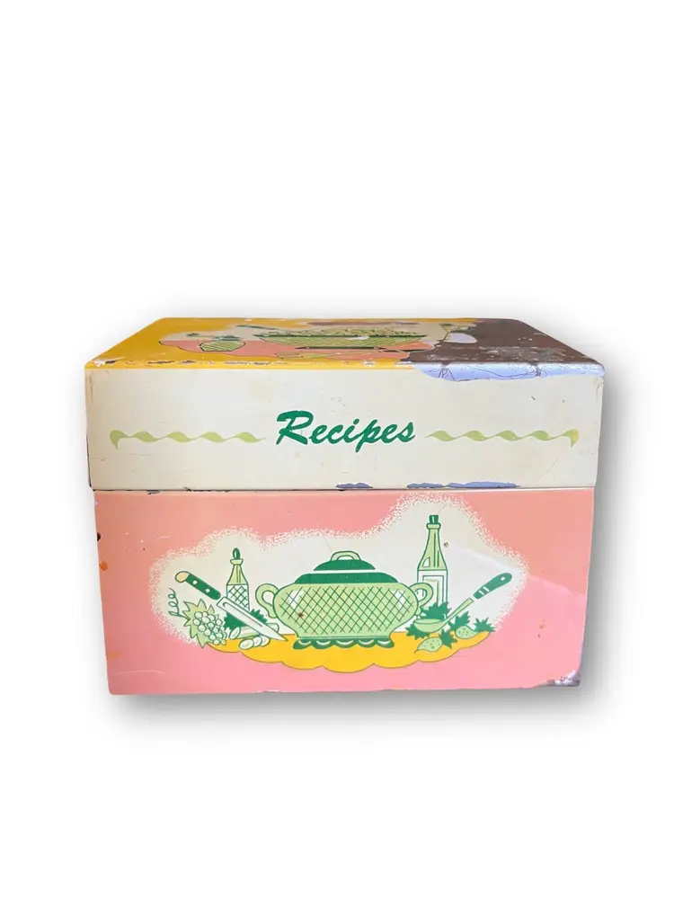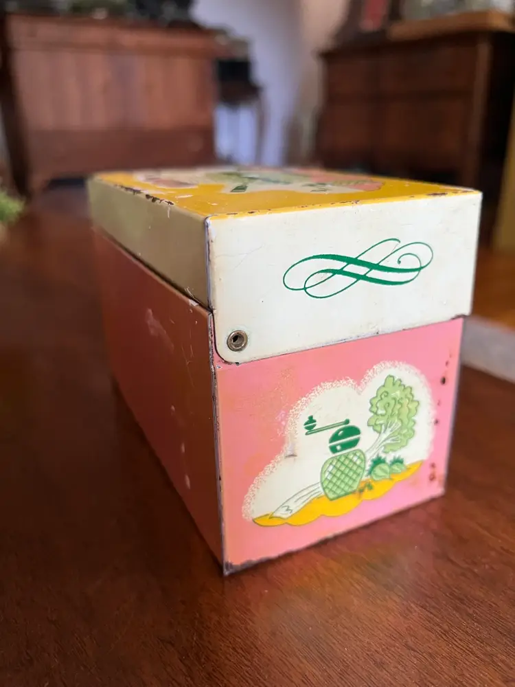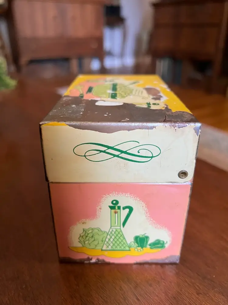 PLEASE view ALL photos. The graphic coating is gone on large area of top of box, peeling to bottom of box as well. Displays well with lid OPEN. Made by Ohio Art. Full of recipes. Measures 5.25x3x3.75
