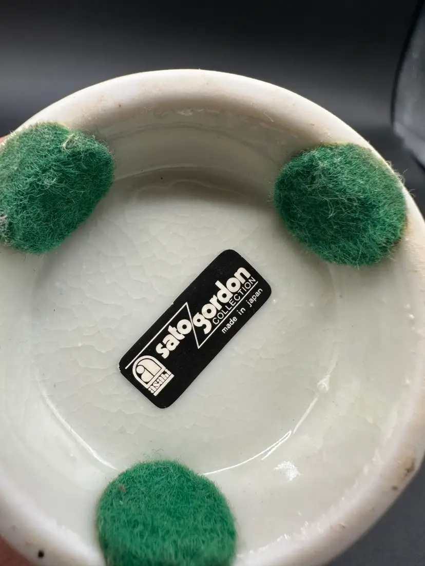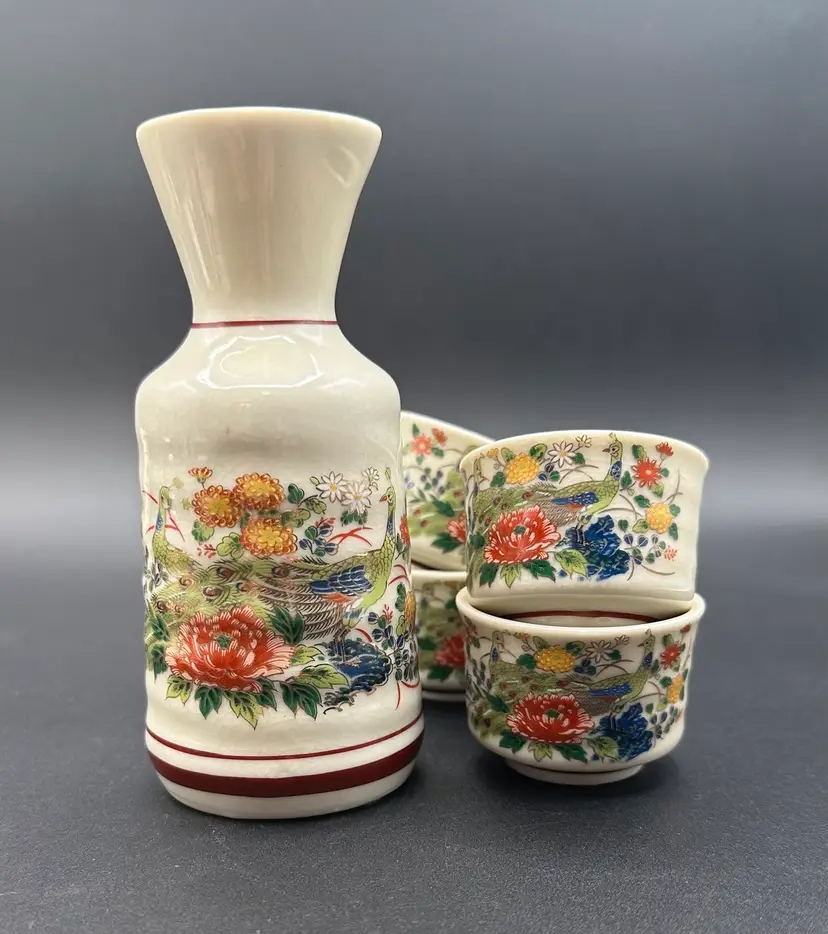 Original stickers on all, gorgeous burgundy details and bold florals with gold lined peacocks! No chips or cracks but plenty of crazing.