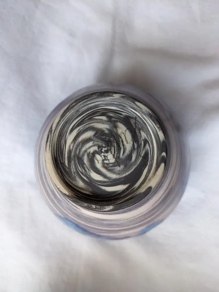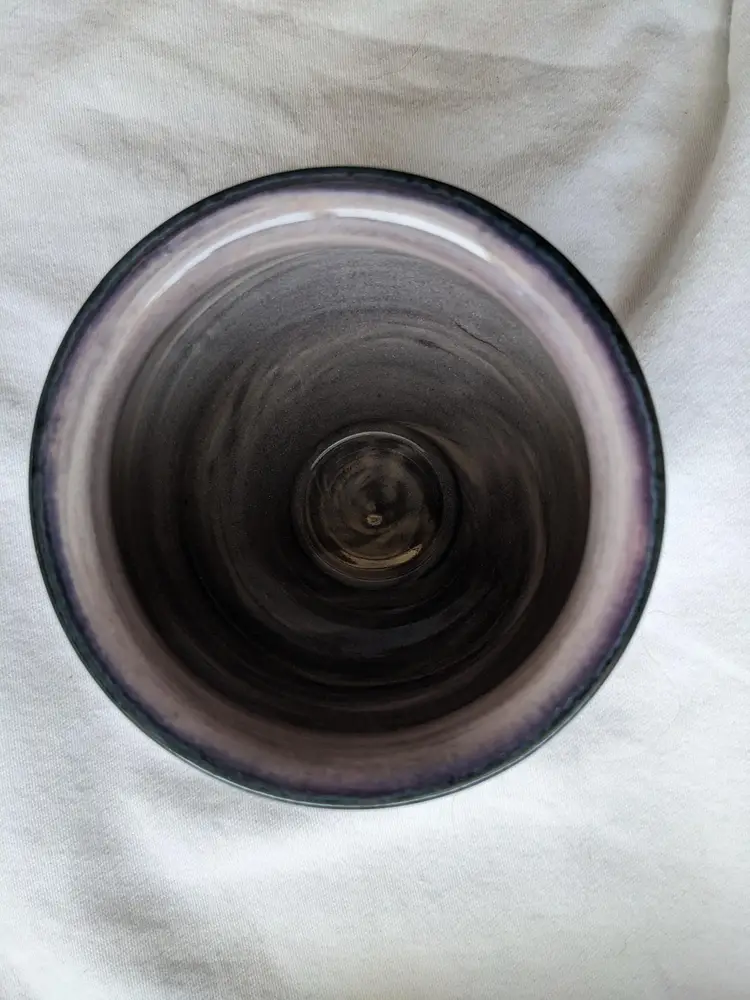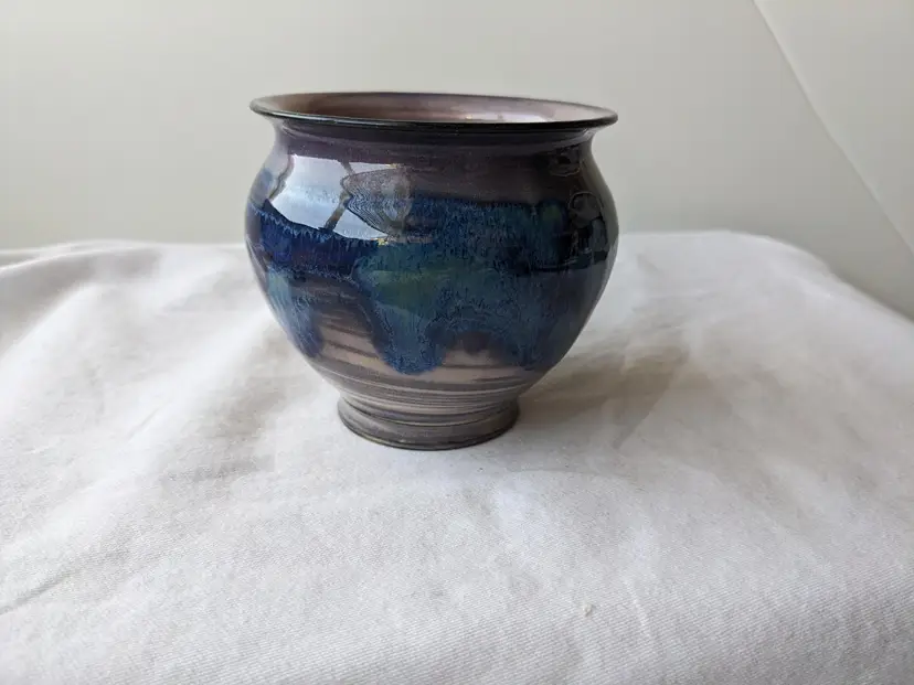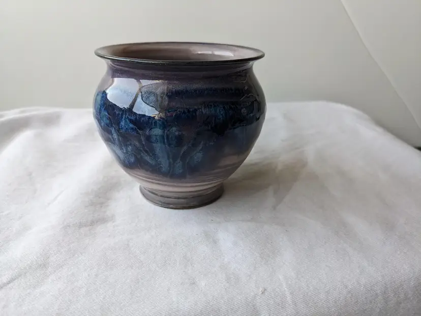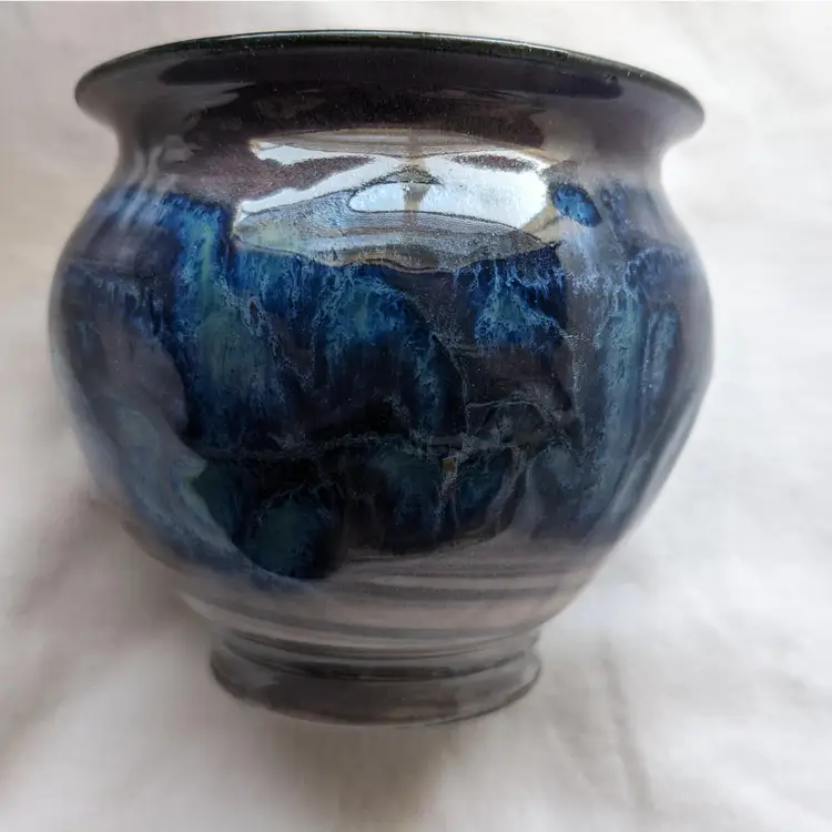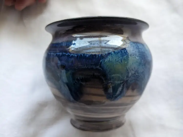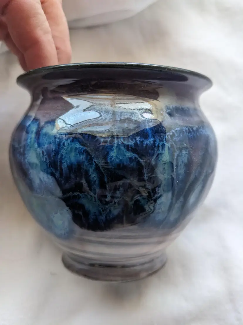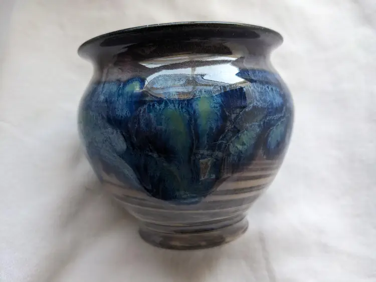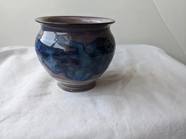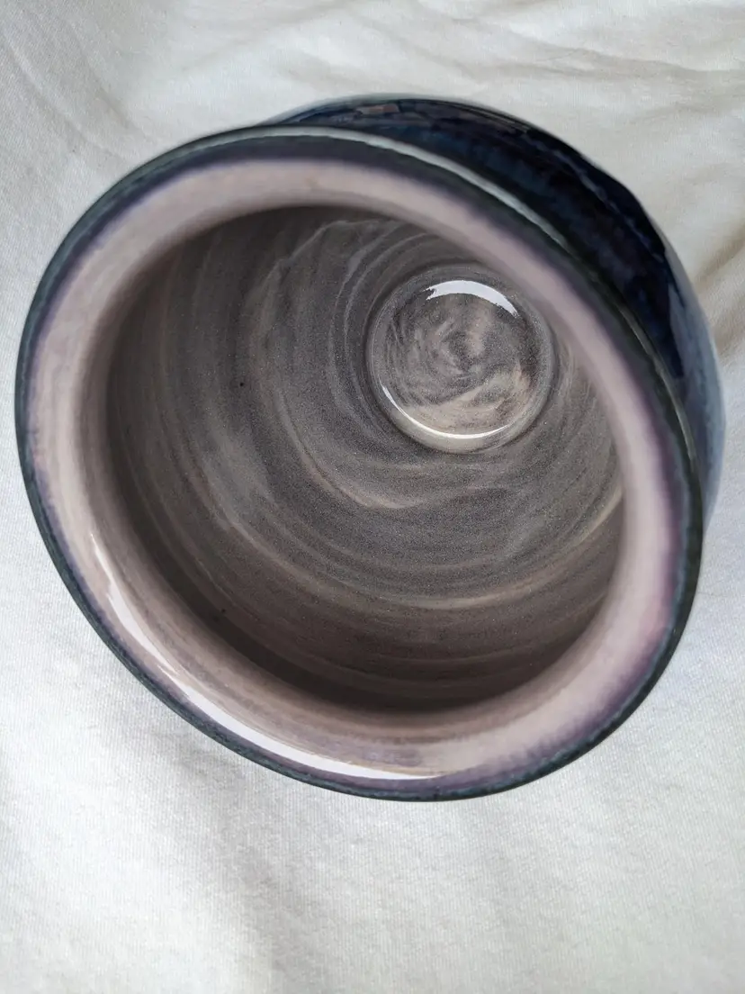 Ashburn Pottery, Canada John & Carole Bandurchin Small bowl Handmade wheel thrown pottery Design: Blue Glaze exterior, two-tone clay Signed on base - see photo