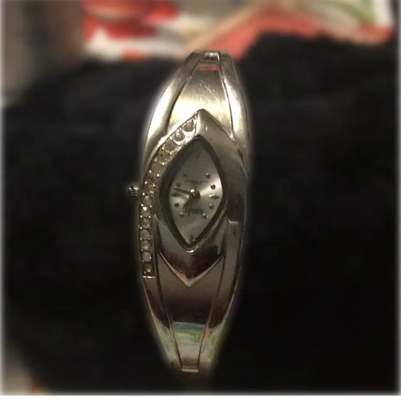 A beautiful silver tone watch with solid bangle style band and rhinestones adorning the face. Quartz and water resistant.