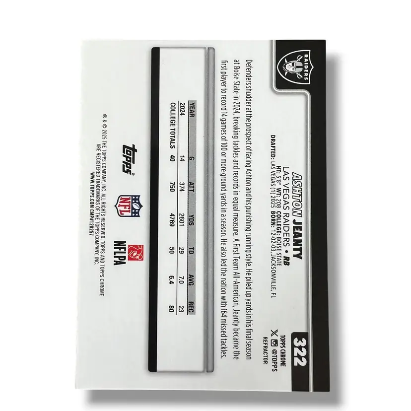 Here We Have a Ashton Jeanty RC Raiders 2025 Topps Chrome Football RC Refractor #322