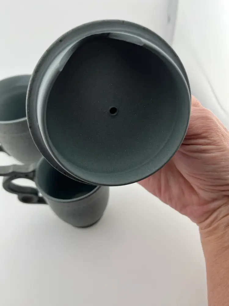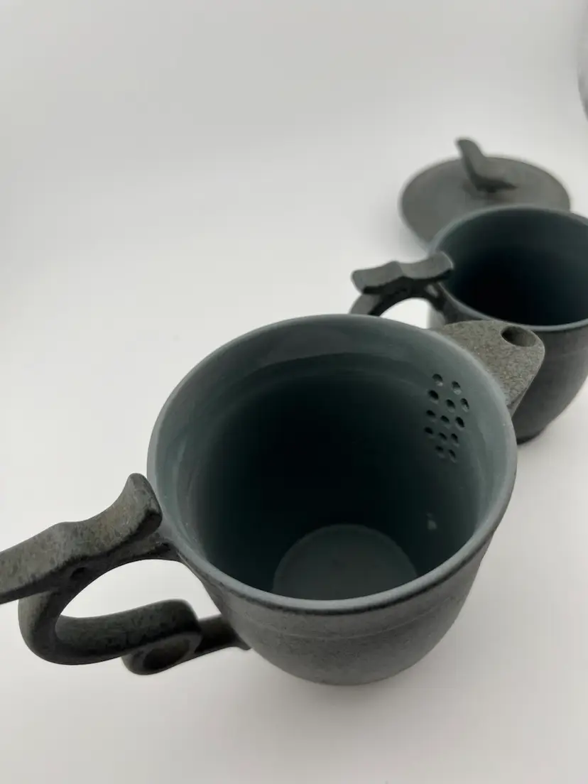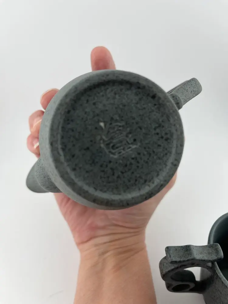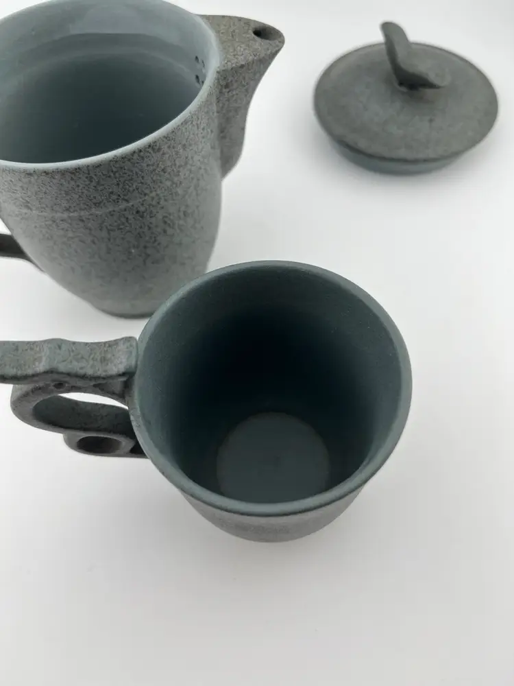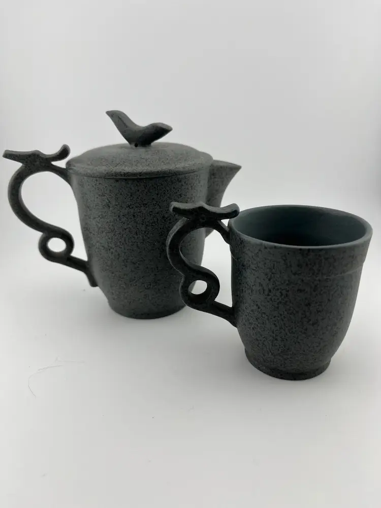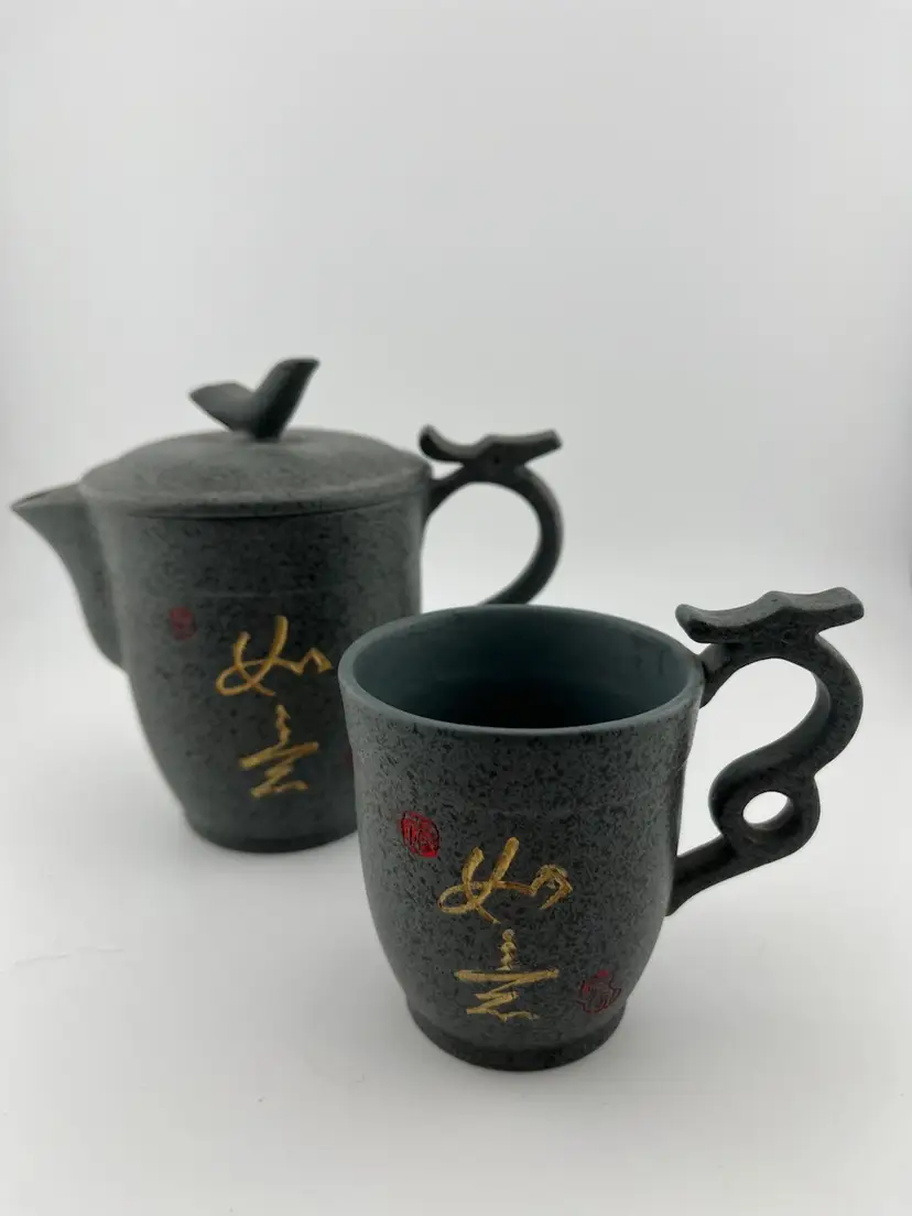 Unsure what inscription says. Beautifully crafted in a dark speckled gray color with gold and red paint. Pot 5" x 5.25" Cup 2.75" x 3.5". No chips or cracks. Makers Mark on bottom of teapot.
