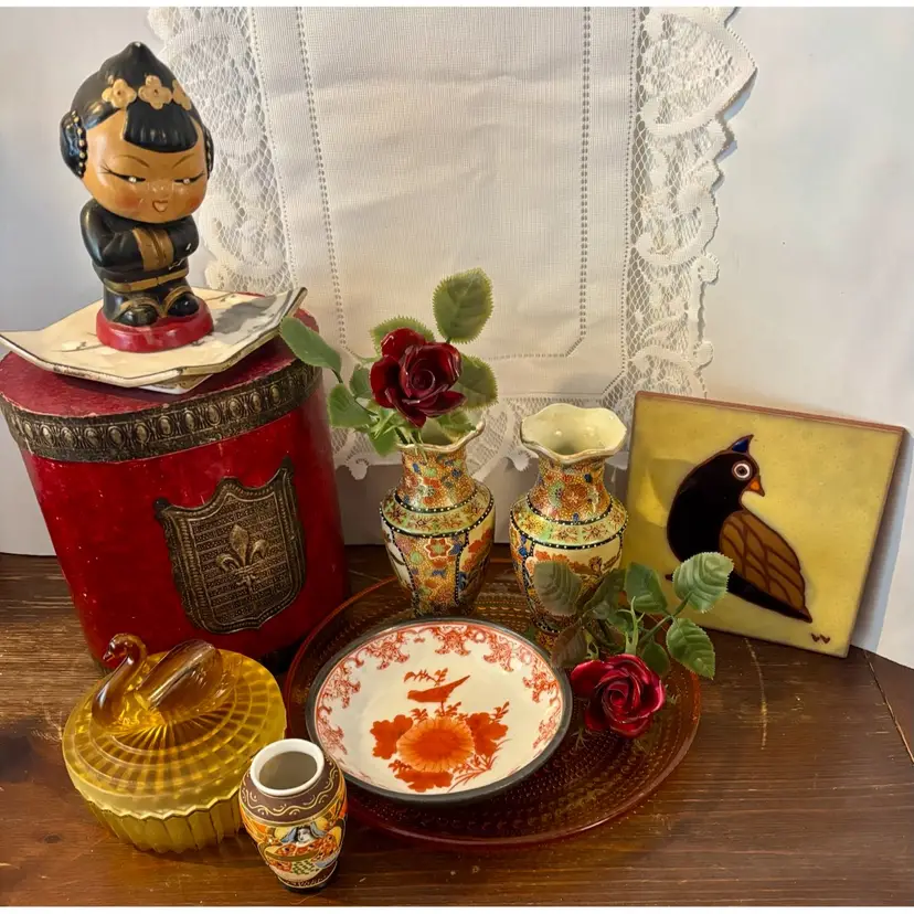 -Enamel glazed heavy pewter backed and trimmed vintage bowl with beautiful hand painted orange bird design -Deep red oval box w/lid (paper maché?) -Wood bobble head person vintage -Swan amber glass vanity dish w/lid vintage (swan is designed to hold lipstick) -Square enamel glazed hand painted trinket dish -2 Satsuma Japanese hand painted porcelain vases -1 Small Satsuma Japanese hand painted porcelain vase -2 Ceramic painted dark red roses -Terracotta enamel hand painted yellow w/bird tile -Round orange glass plate w/ raised edge