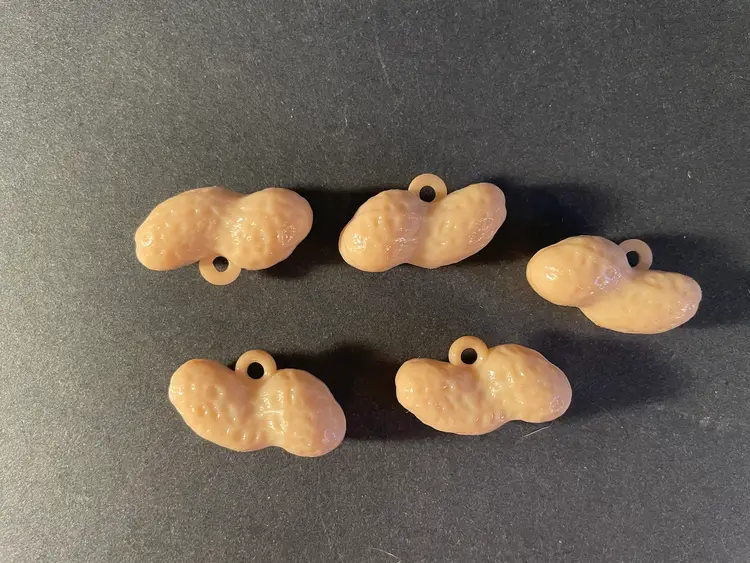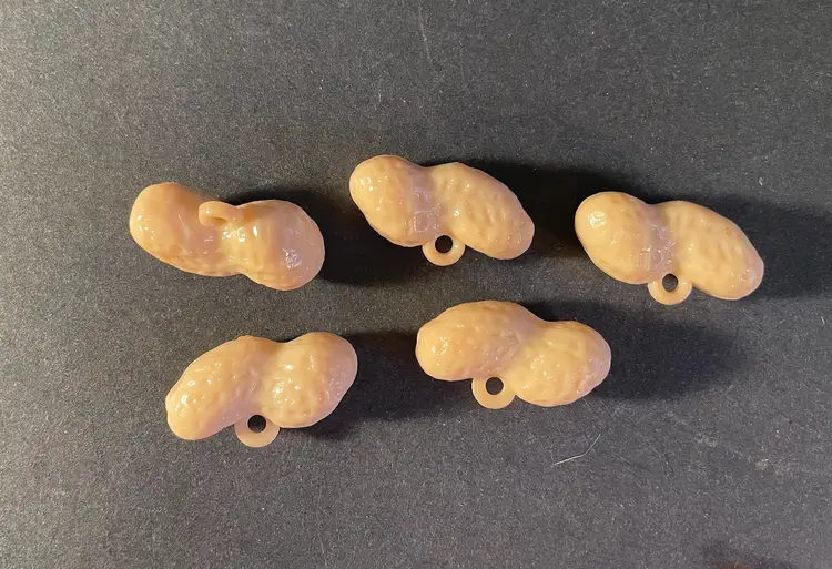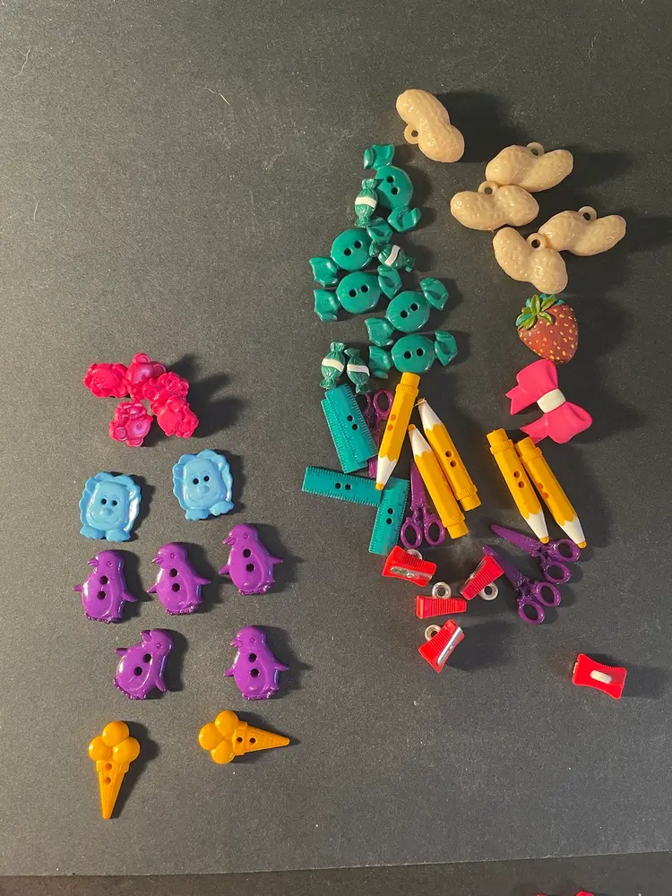 48 assorted plastic novelty buttons. Penguins, lions, mice, ice cream cones, pencils, pencil sharpeners, scissors, rulers, candy, peanuts, a bow and a strawberry. The pencil buttons are 1 3/4” long, the rest are a little smaller.