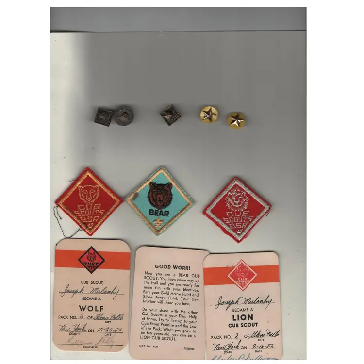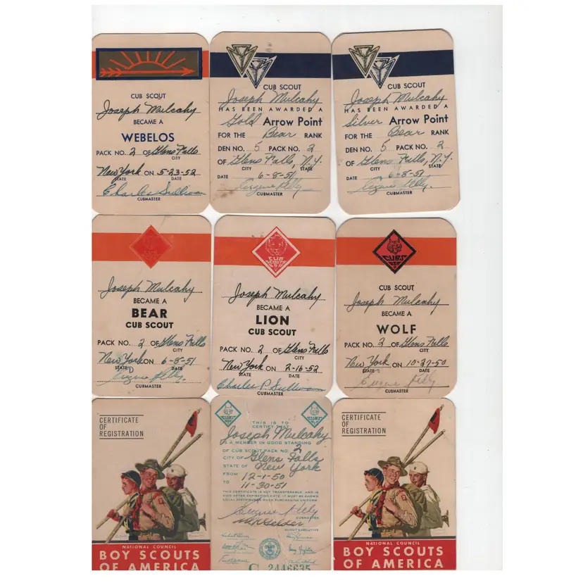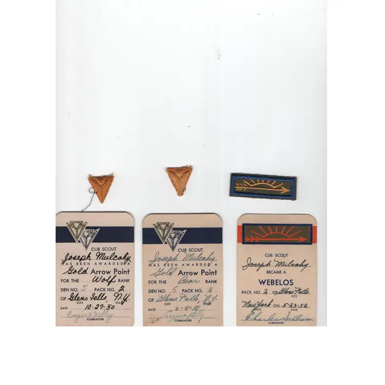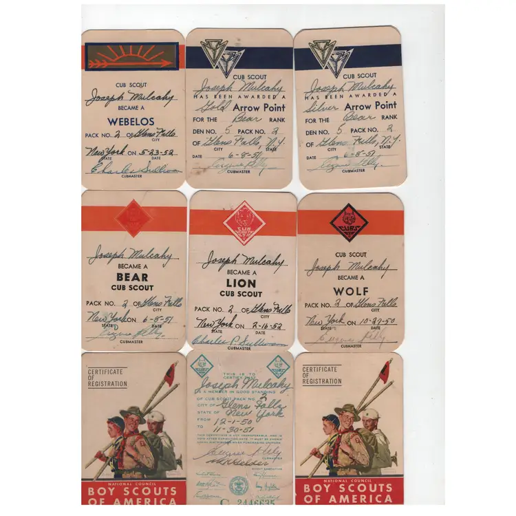 This is a collection of one individual in scouts in the 1950s. Registration cards, rank cards, rank awards, arrow points, and pins. All good to add to your scout collection.