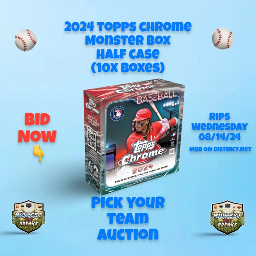 You are bidding on all the cards of the team listed in the title in this 2024 Topps Chrome MONSTER BOX Half Case rip (10 Monster Boxes). Rip will happen on the main Midwest Box Breaks District community immediately after all teams end Wednesday, August 14th at apx 9 PM EST / 6 PM PST. Any spot won where no cards of the team are found in the box will receive a sealed pack of Topps retail product.