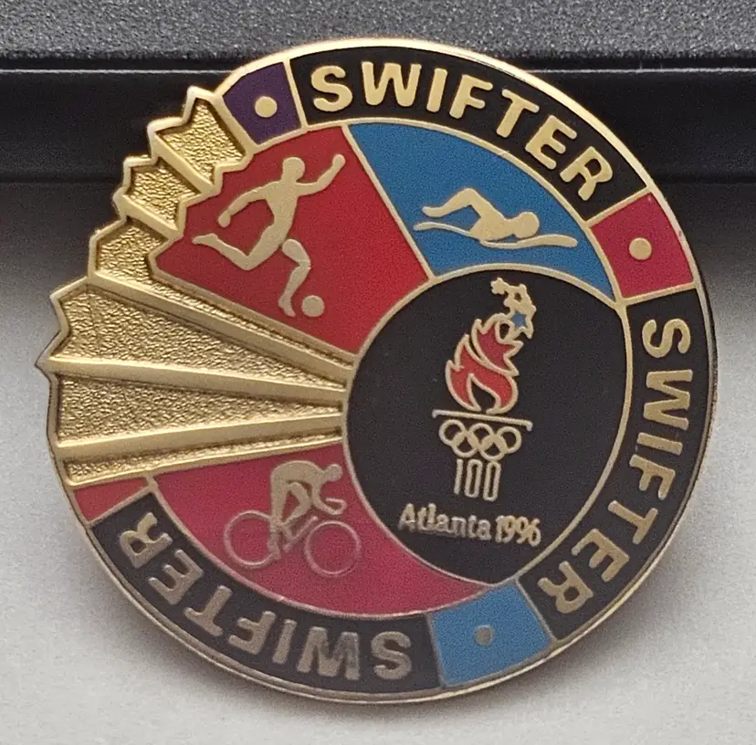 The Atlanta 1996 Swifter Soccer Swimming Cycling Olympic Pin is a commemorative pin showcasing the iconic colors of the Olympic flag. Representing swimming as the featured sport, this multi-color pin pays tribute to the Atlanta 1996 Olympic Games. With a nod to both great American athletes and the host country China, this collectible item celebrates the spirit of sportsmanship and unity during the historic event. Perfect for fans of both swimming and the Olympics, this pin is a unique and nostalgic piece of memorabilia.