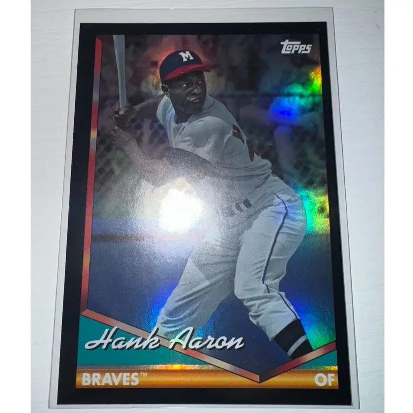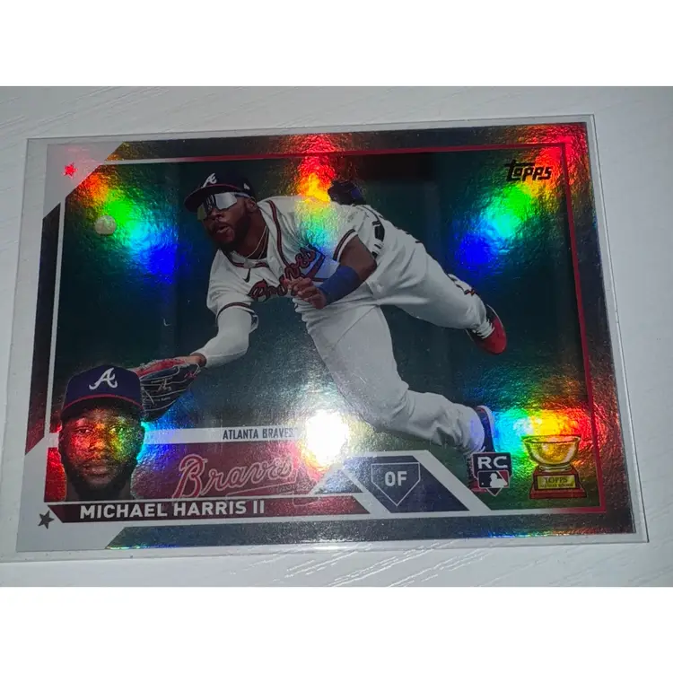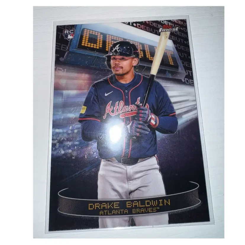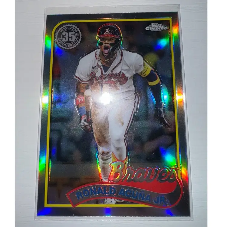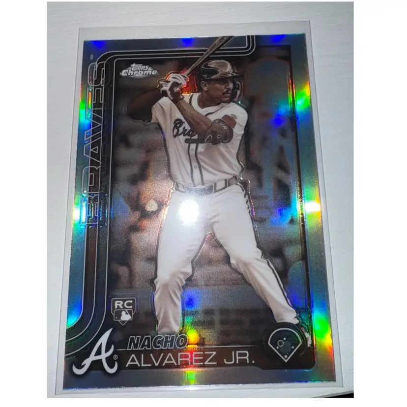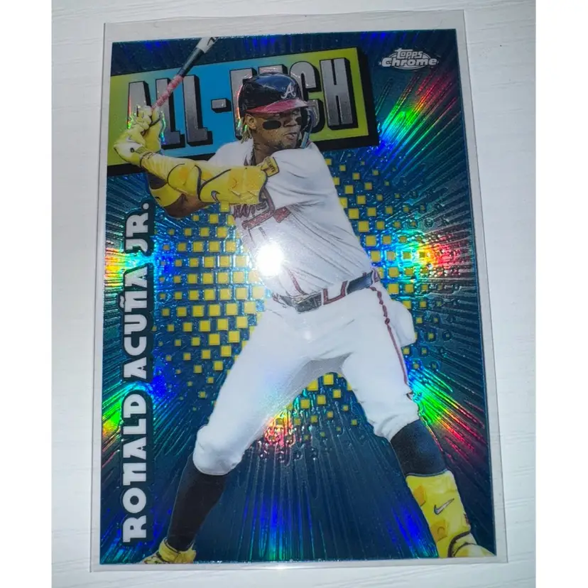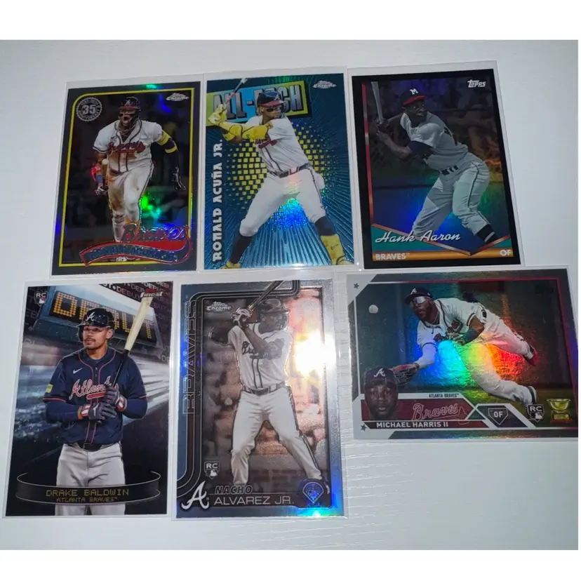 This 6 card lot includes: Ronald Acuna Jr 2025 All Etch Ronald Acuna Jr 2024 ‘89 Insert Hank Aaron 2024 Topps Archives Black Drake Baldwin 2025 Topps Finest Debut Nacho Alvarez Jr 2025 Sepia Michael Harris II 2023 Rc Rainbow Foil