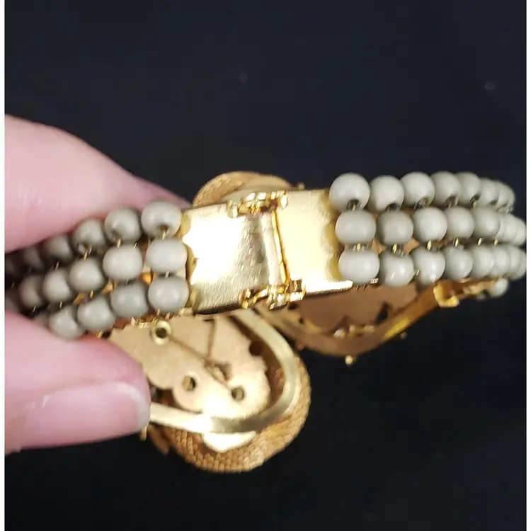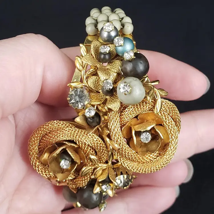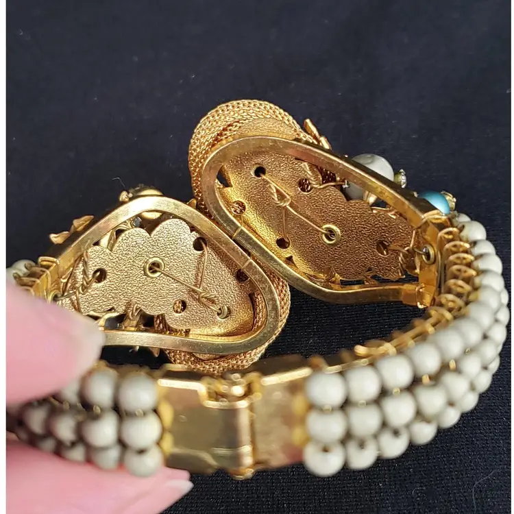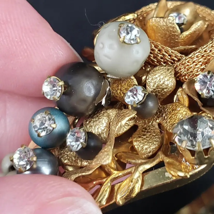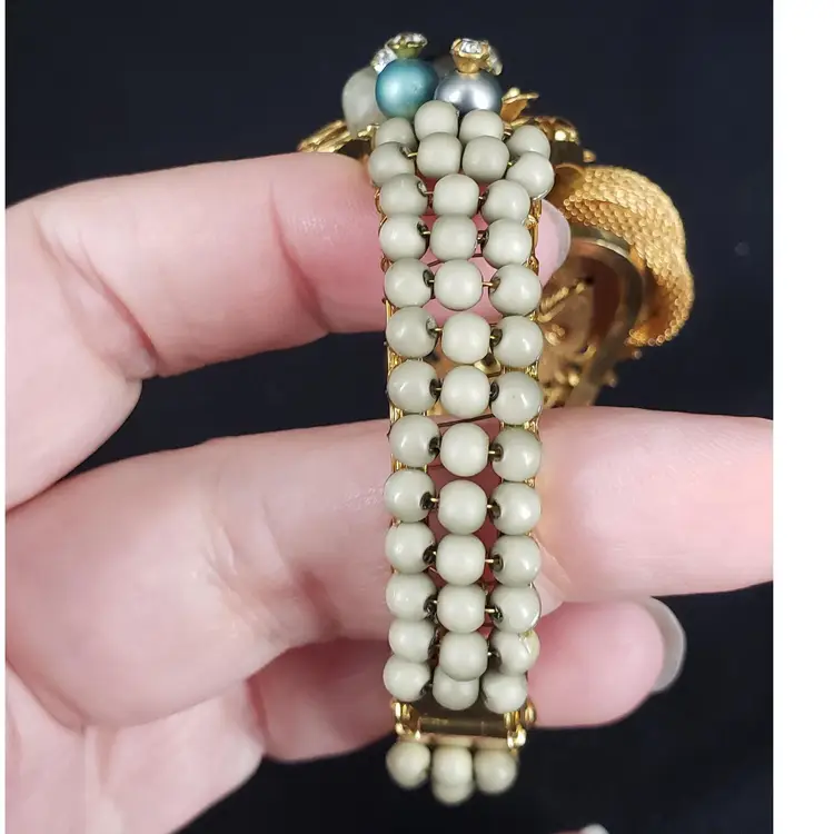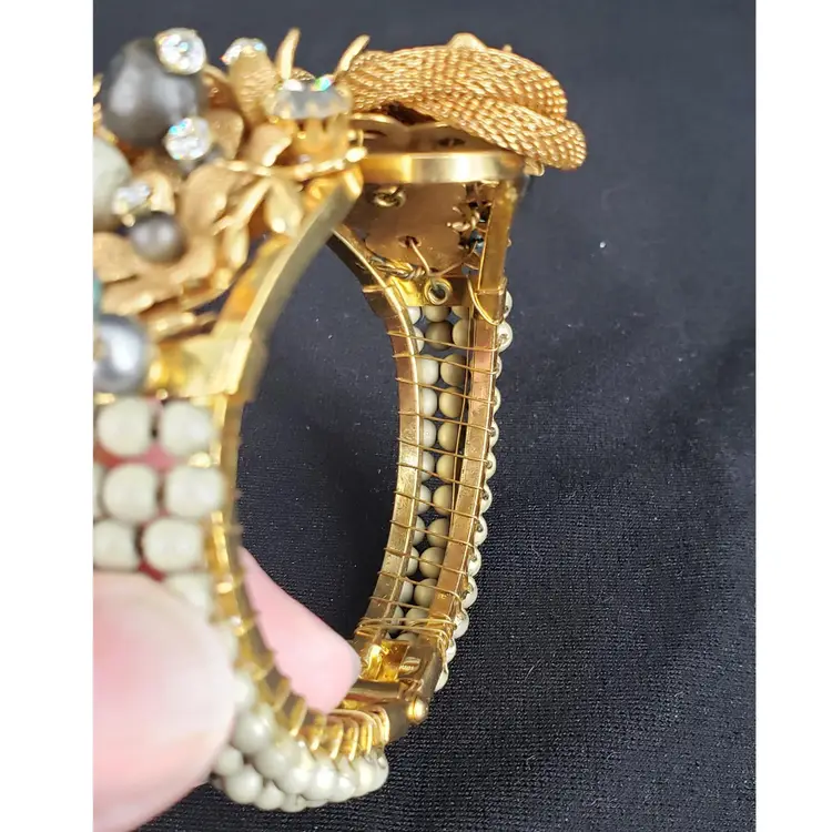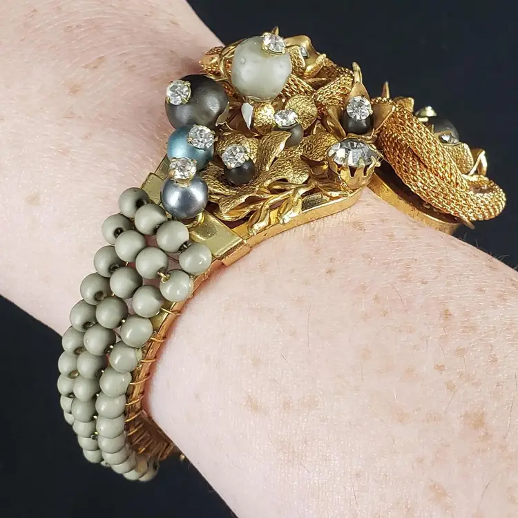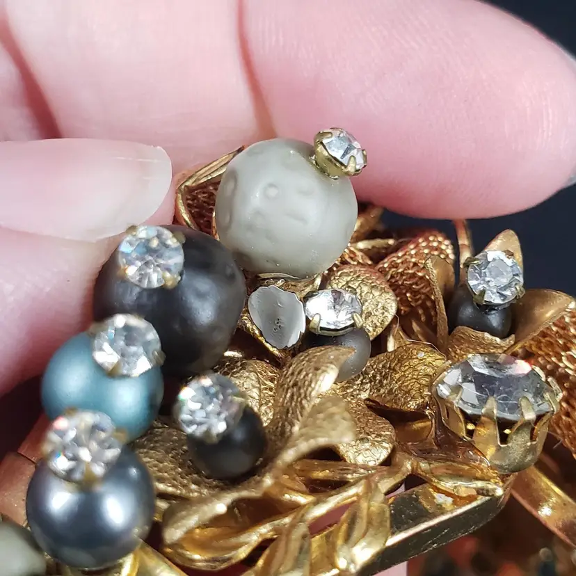 This stunning vintage bracelet features a beautiful floral design with multicolored rhinestones and imitation pearls. The bracelet is 7.5 inches in length and has a clamp closure. It is made with gold-tone metal, and the setting style is a cluster pearls and rhinestones. This bracelet is perfect for any occasion and is a piece attributed to Miriam Haskell. The vintage piece is in excellent condition and is a must-have for any fashion-forward jewelry collection. There is one Dark gray pearl that lost a bit of paint, the paint is still attached to the bracelet. Please see pictures.