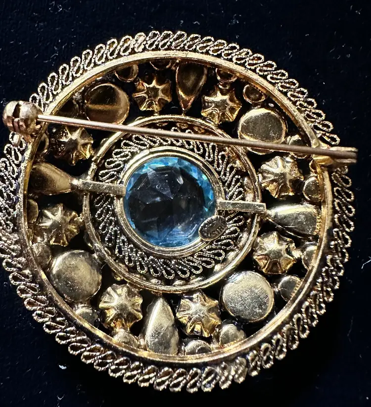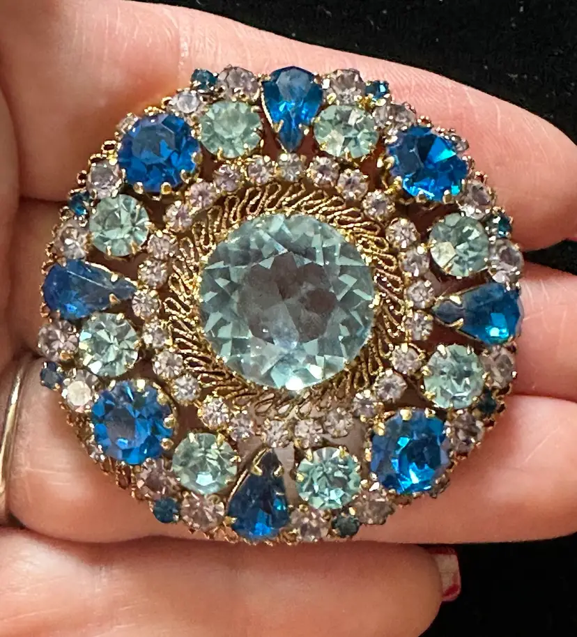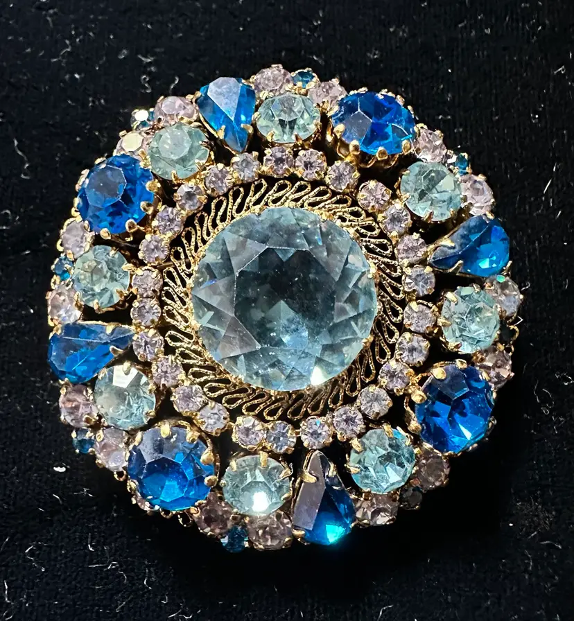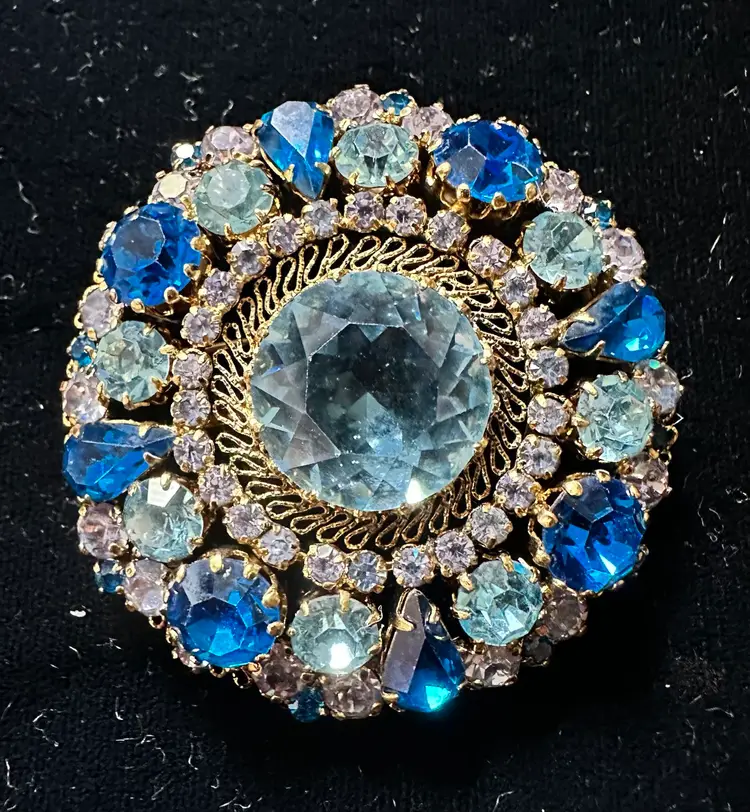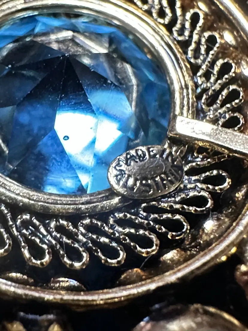 Lovely vintage brooch signed made in Austria is gold tone set with blue Austrian crystal stones. It is 2”. Excellent condition.