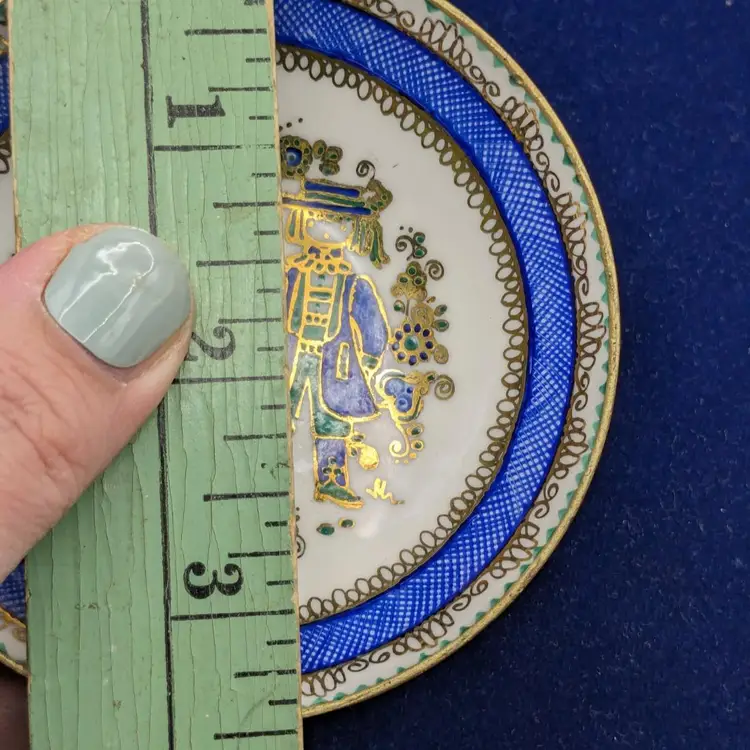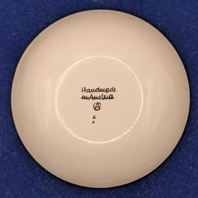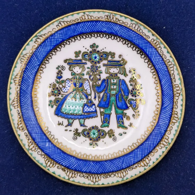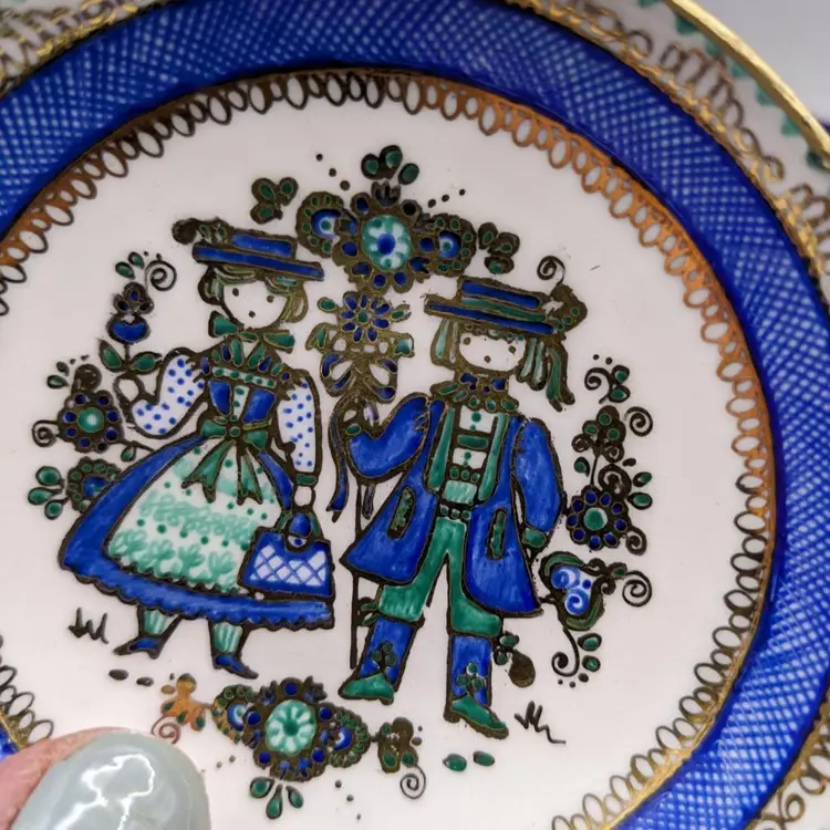 This adorable enamel trinket dish featuring a girl and boy measures approximately 3.5 inches in diameter. It was made in Austria at some point in the 1960s and is beautifully hand-painted in blue, white, and gold detail. While it resembles Steinbock Email enameled items, I'm not entirely sure who manufactured it.