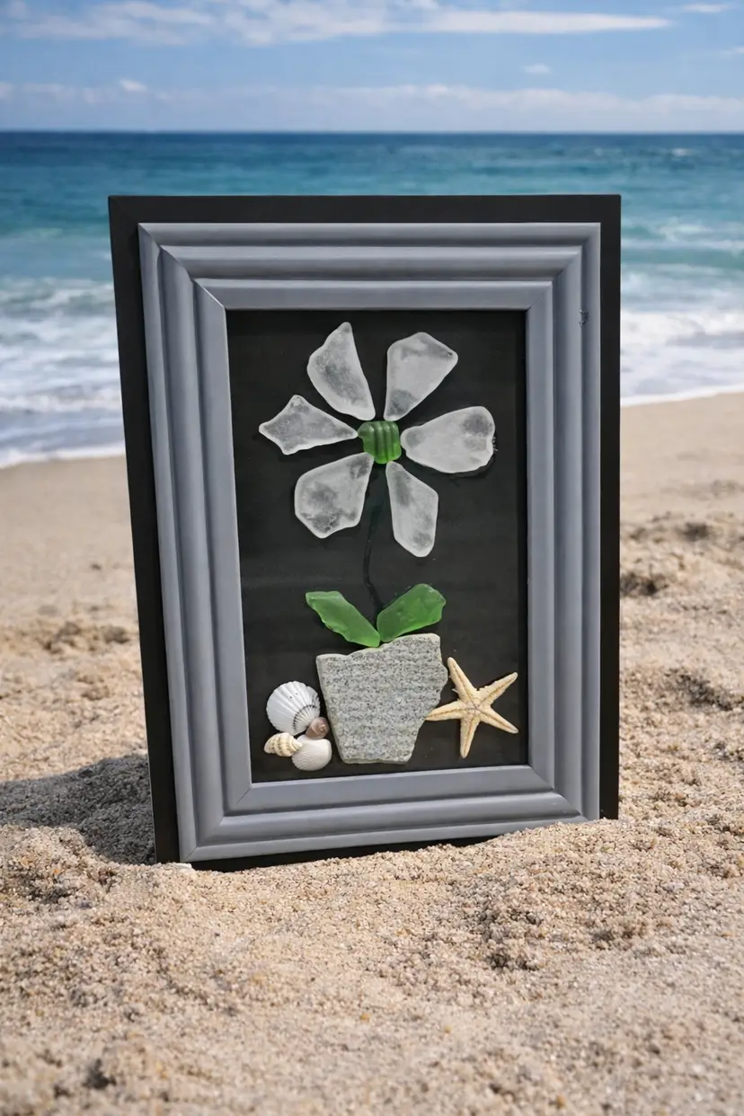 This authentic sea glass art flower with shells and starfish is a beautifully handmade piece that showcases the natural beauty of the beach. The intricate design incorporates sea glass, shells, and starfish, adding a unique touch to any space. Each piece is carefully crafted by hand, making it a truly one-of-a-kind decorative item for your home. The beach glass components give it a unique and organic aesthetic, perfect for adding a coastal charm to your living space.