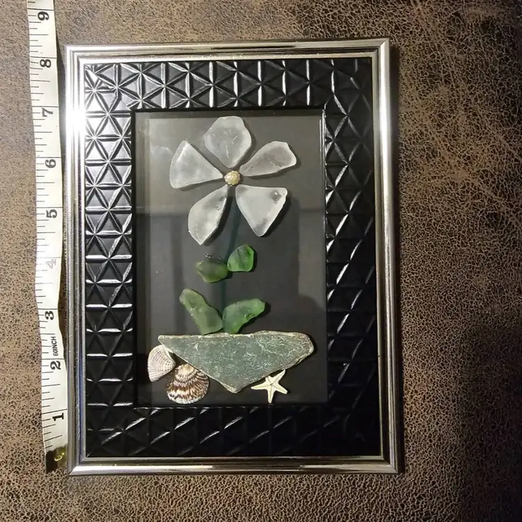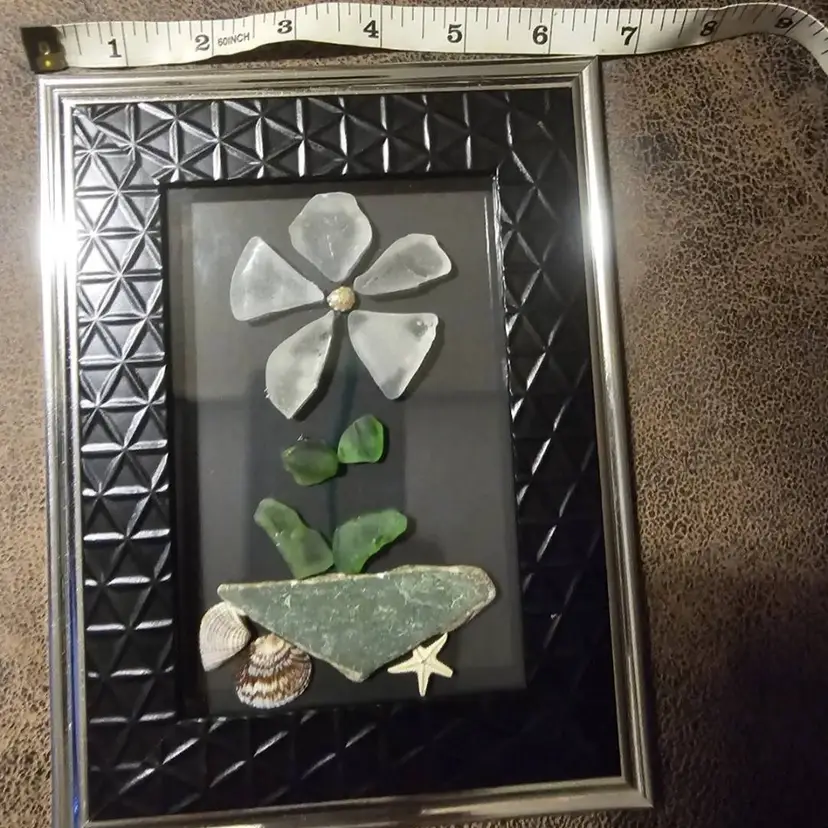The product is a beautifully crafted piece of authentic sea glass framed art featuring a flower design adorned with shells and starfish, creating a whimsical beachy aesthetic. Each piece is handmade, ensuring a unique and one-of-a-kind decorative item for any space. The use of sea glass adds a touch of natural beauty and elegance to the art, making it a perfect addition to beach-inspired decor
