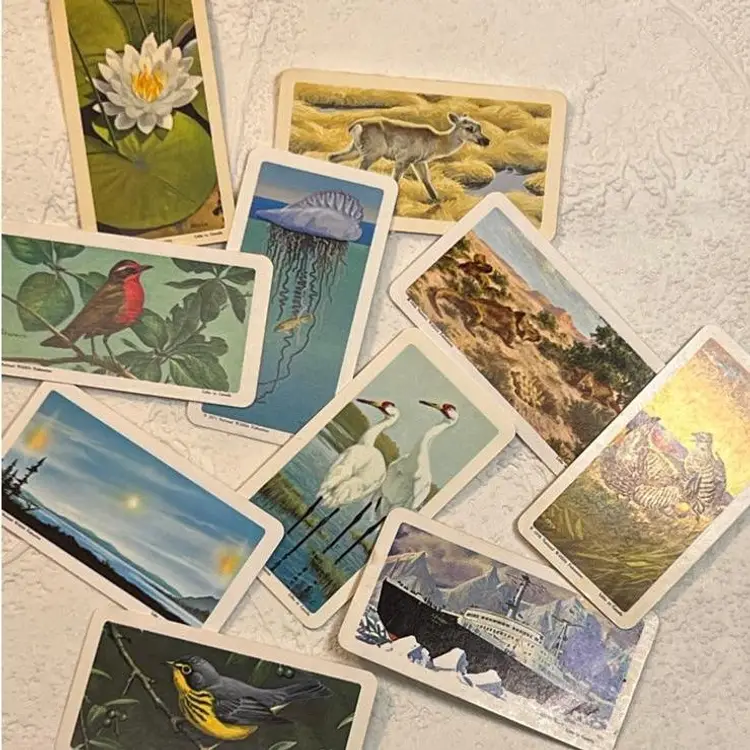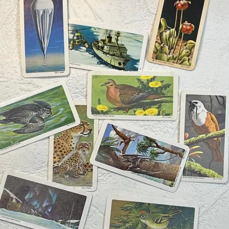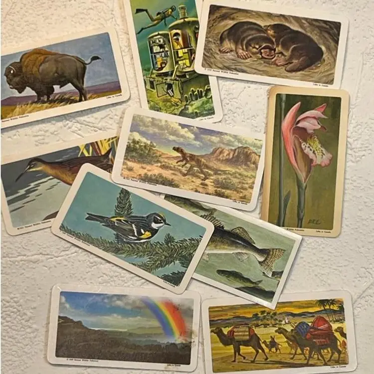 Cards are randomly selected from the following sets: Exploring the Ocean, Animals and their Young, North American Wildlife in Danger, Canadian/American Songbirds, The Space Age, Dinosaurs, Birds of North America, Wildflowers of North America, Transportation Through the Ages, and Tropical Birds.