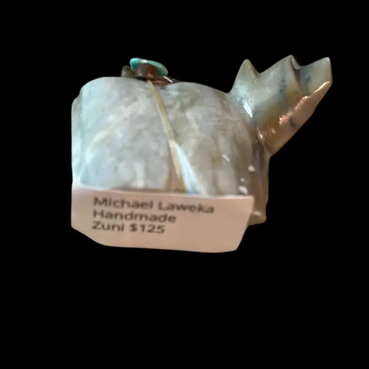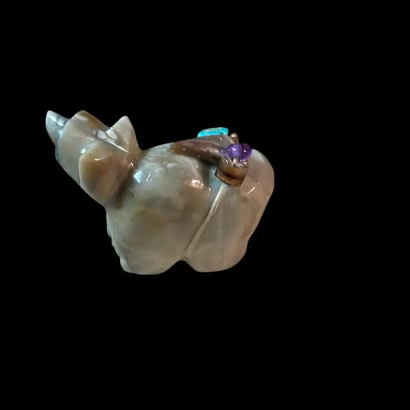 Zuni bear fetish carving, often made from stone like Picasso marble, which represents healing and strength in Zuni culture. Zuni fetishes are small carvings, often made from various stones, created by the Zuni people for ceremonial purposes and as art. The bear is considered the guardian of the West and is associated with qualities such as strength, self-knowledge, courage, and healing powers. The small bundle attached to the back, typically with turquoise and other stones, is an offering to enhance the spirit's power