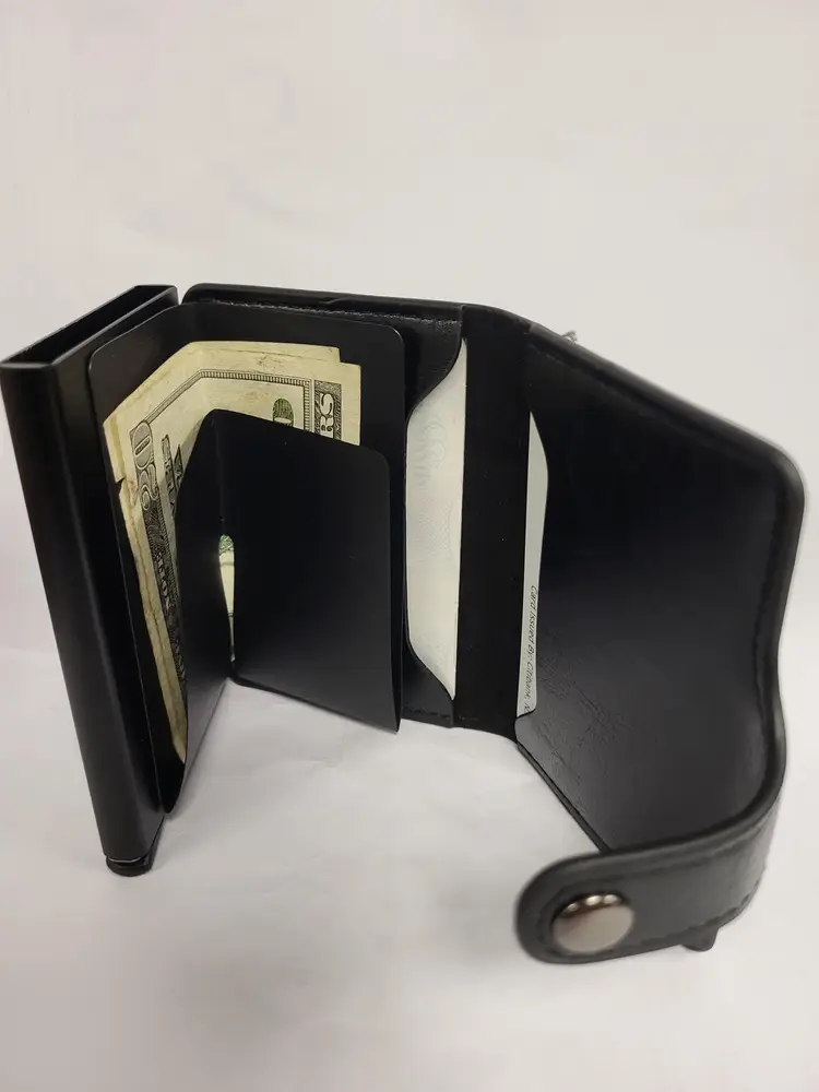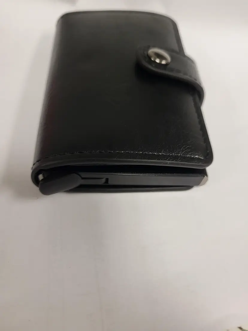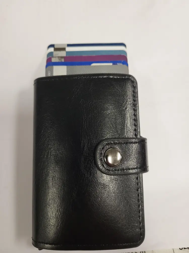 Synthetic leather. Good quality. Holds around 7 cards and includes a cash storage area.