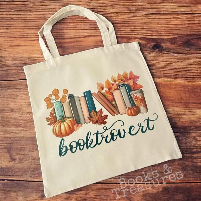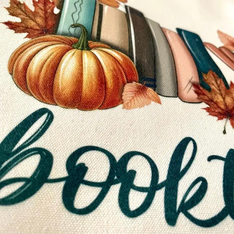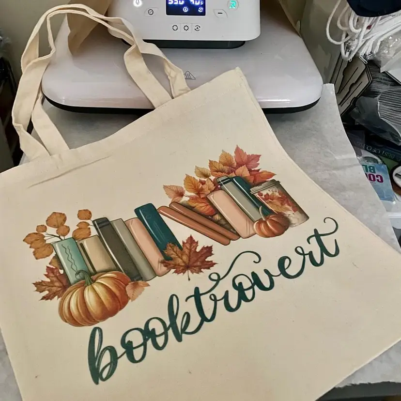 This bag has an adorable bookish fall design on one side. A gorgeous image of books surrounded by pumpkins and leaves. The bag measures 15x16”. Due to the handmade nature of our items placement, image size, and coloring may look slightly different than pictured.