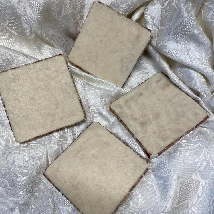 These are very pretty mosaic drink coasters! They are sturdy and solid, as well as unique! I only made one set of this style. The mosaic is made from mirror tiles, stained glass and glittery tiles are well. All grouted on a tile base, with a glued on felt backing.