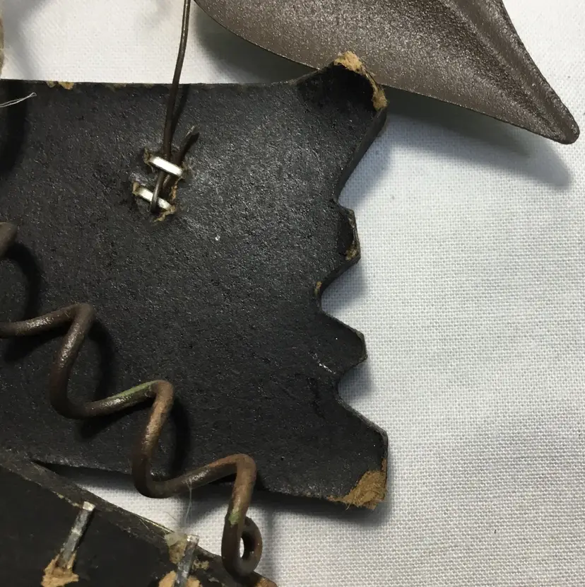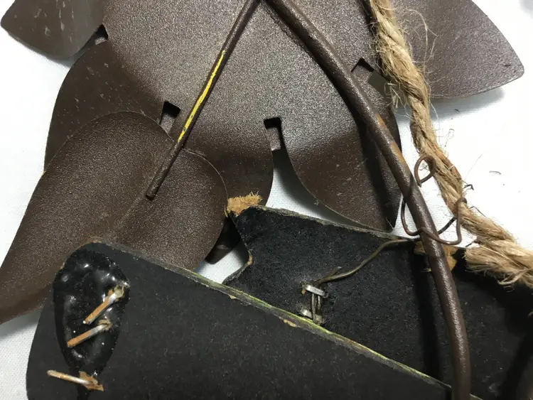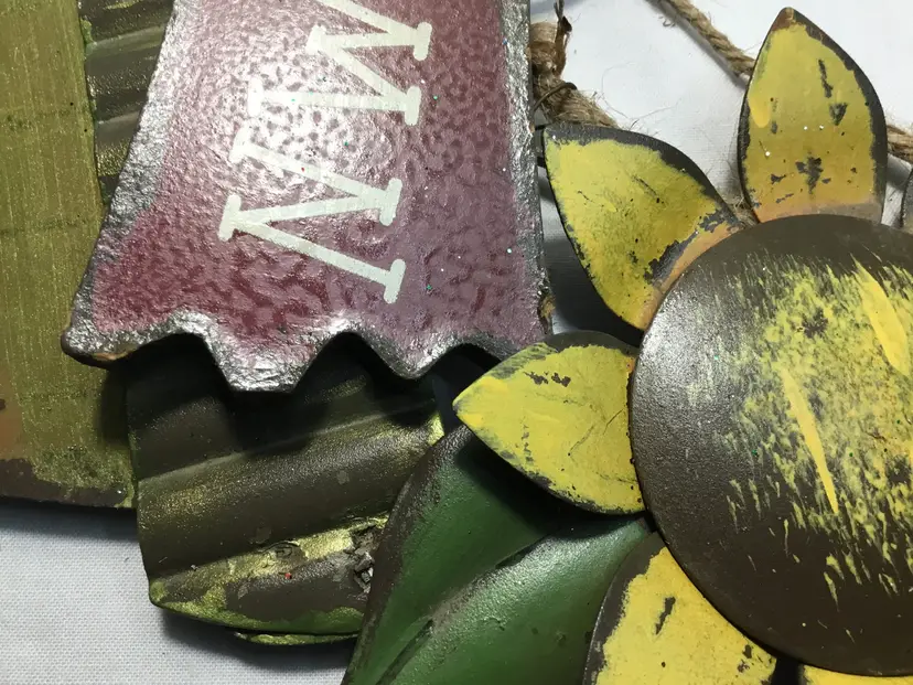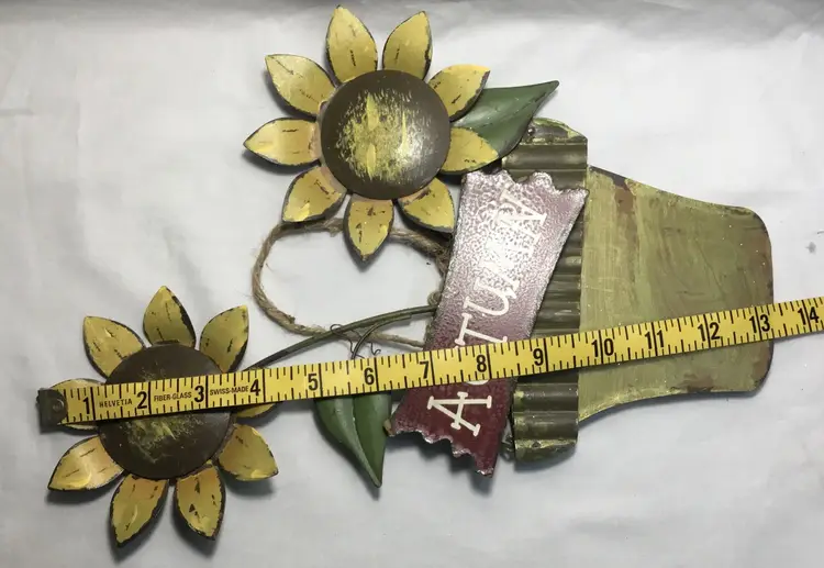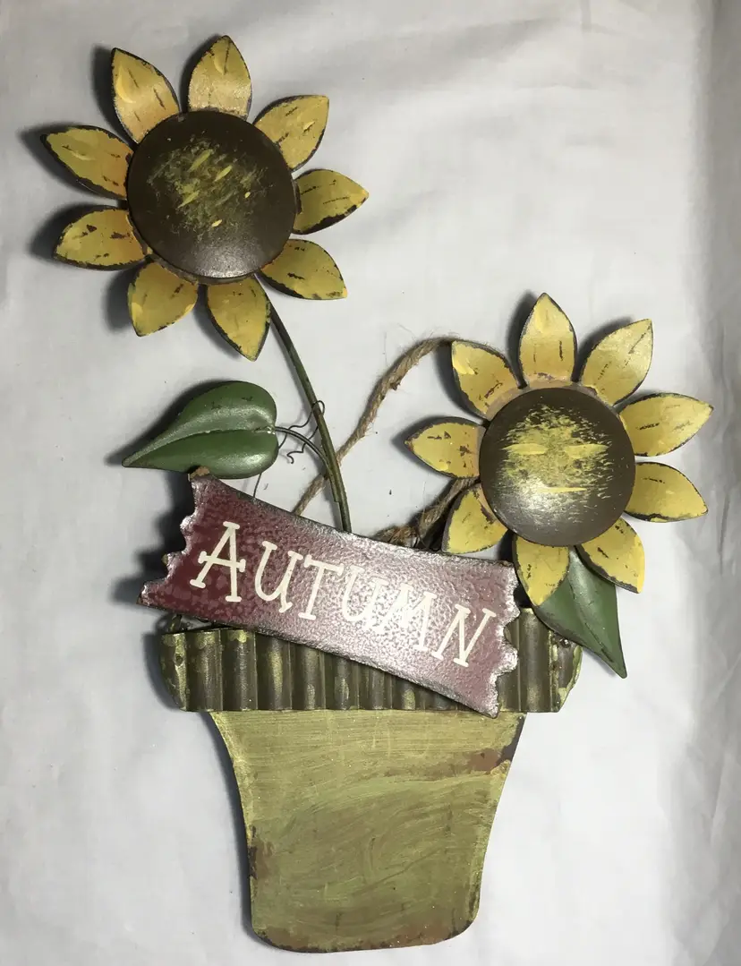 Approx. 13 inches tall by 9 inches wide, door or wall sign with particle board plant pot, and small banner that says, "Autumn." Pot has 2 metal sunflowers with metal leaves. All is painted, green, yellow, brown., black on the back side. Has slightly distressed look, vintage look. Twine hanging loop. Slight wear on corners of "Autumn" sign (See all photos)