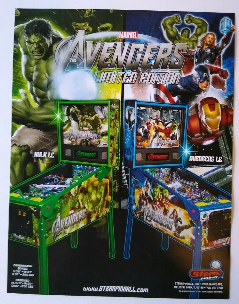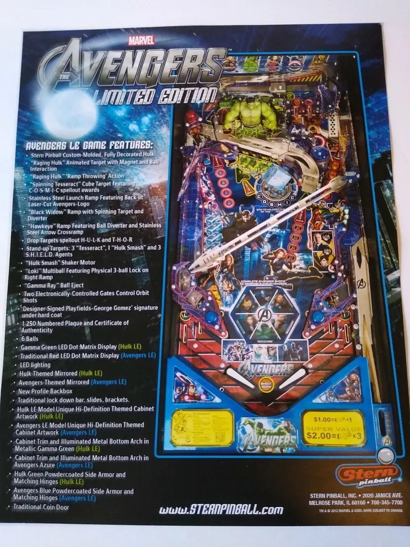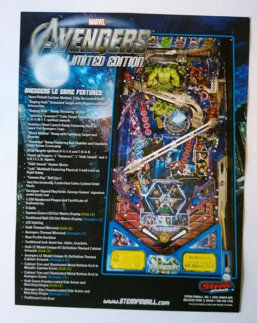 Original: Paper Advertising Flyer Model: Avengers Limited Edition Pinball: Flyer Subject: Marvel Comics Modified Item: No Country/Region of Manufacture: United States Year: 2012 Brand: Stern