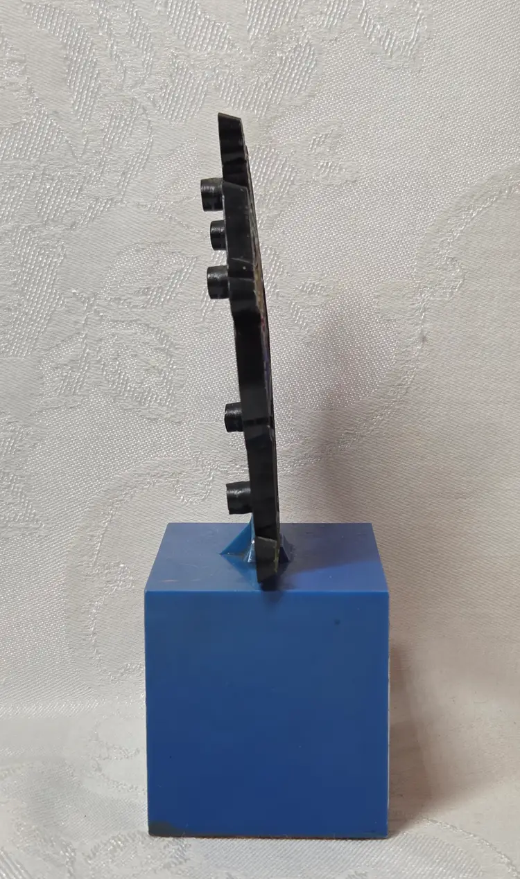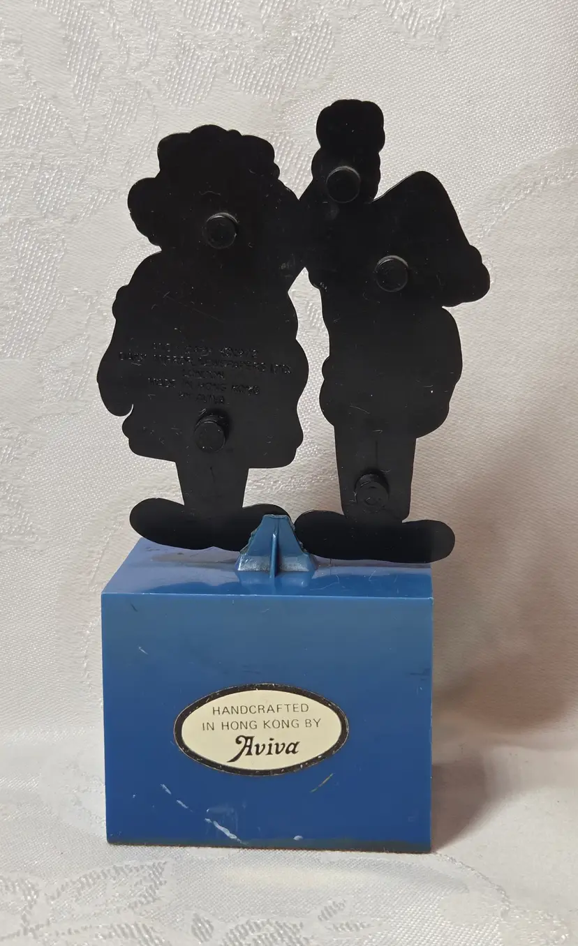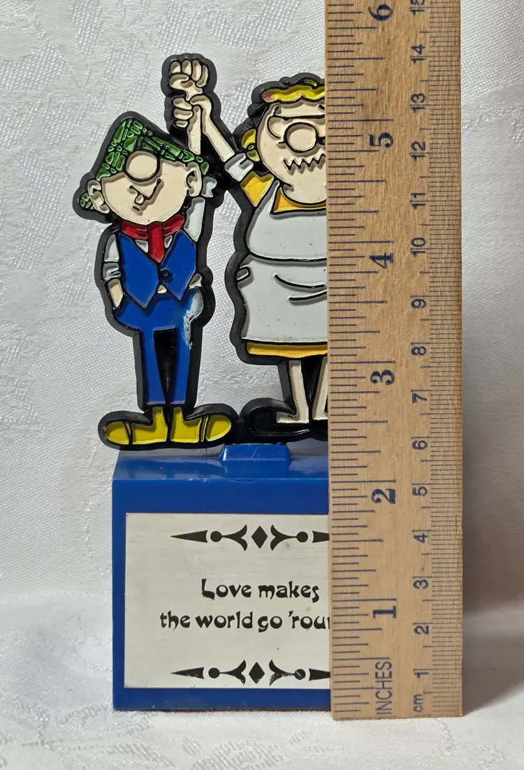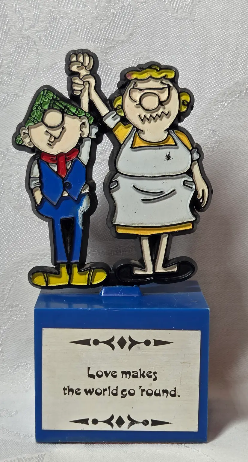 The Aviva 1972 Andy Capp Plastic Trophy featuring the iconic cartoon character Andy Capp from the Mirror newspapers franchise is a vintage collectible item made of plastic. Standing at 5.5 inches tall, this original trophy showcases the comedic and charming essence of the beloved cartoon series from the 1970s. With its nostalgic appeal and unique design, this item commemorates the timeless theme of love making the world go round, making it a must-have for any avid collector of animation merchandise.