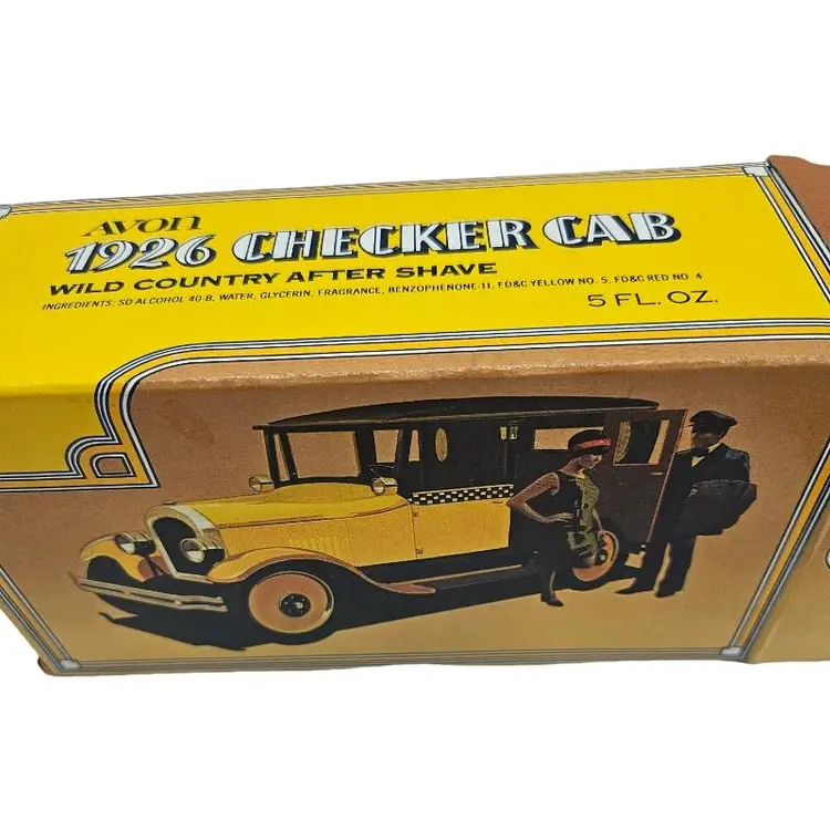 1926 checkers cab after shave dispenser of wild turkey. Dispenser has been emptied. Comes with original box stickers.