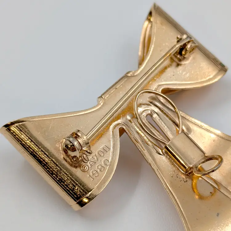 Charming vintage goldtone bow brooch or pendant. Back has rollover clasp and a loop to wear as a pendant. Striped texture on the front. Signed on the back Avon 1980. Good vintage condition, no visual wear on the front, but the back has some finish wear.