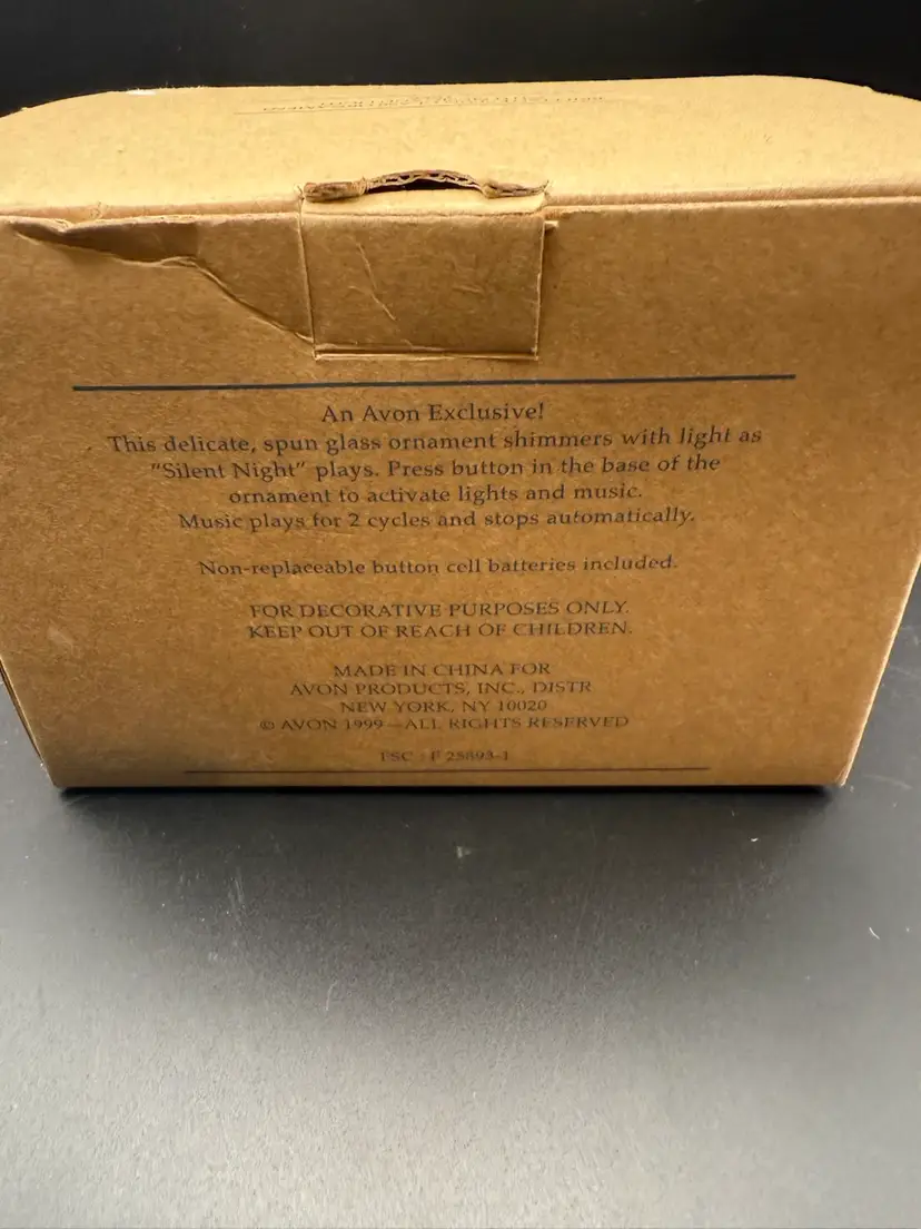 The ornament is from the 1999 Avon Gift Collection. It features a spun glass tree inside a clear glass teardrop shape, topped with a gold star. This ornament originally included music and light features, though these may no longer be functional in older pieces due to non-replaceable button cell batteries. It's considered a vintage collectible, found in its original box