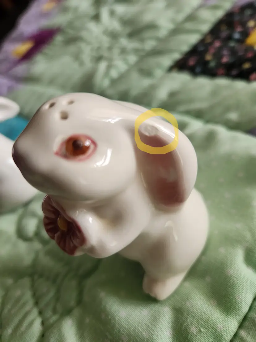 These cute little salt & pepper shakers are 3 inches tall. They are from Avon in 1983. The bunny with the pink flower has a small chip in one ear.