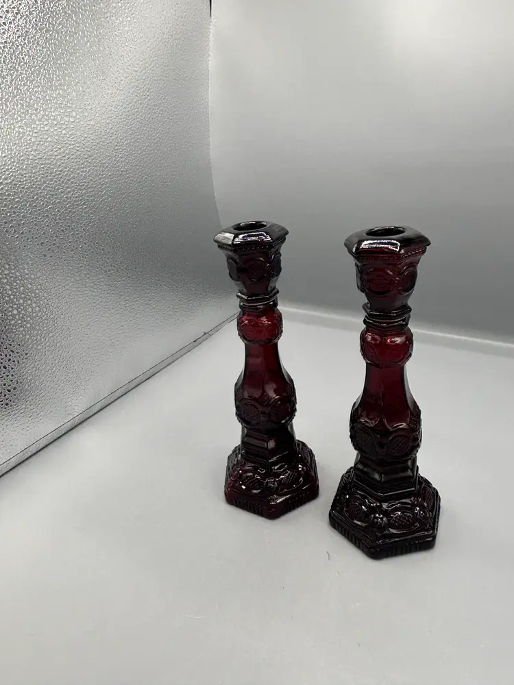 Elegant Avon Cape Cod Ruby candlesticks bring timeless sophistication to any table setting. These classic pieces feature the iconic Cape Cod pattern in rich ruby red glass, perfect for creating an intimate ambiance during dinner parties or special occasions. Standing 8½ inches tall with a 3-inch base diameter, they provide stable, graceful illumination. The deep crimson hue complements both traditional and contemporary décor, making them a versatile addition to your home or a thoughtful gift for collectors of vintage glassware.