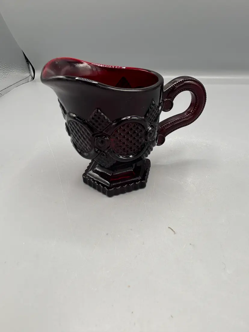 Elegant Avon Cape Cod Ruby creamer with timeless appeal. This vintage piece features the iconic ruby red glass design that defines the Cape Cod collection. Compact and practical, measuring 5½ x 3½ inches, it's perfect for serving cream at the table or displaying as a cherished collectible. A beautiful addition to any classic tableware set