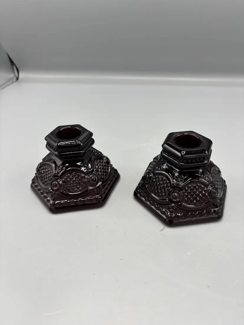 Elegant Avon Cape Cod Ruby short candlesticks bring vintage charm to any table setting. These classic pieces feature the iconic Cape Cod pattern in rich ruby red glass. Standing 3 1/4 inches tall with a 2 1/2-inch base, they're perfectly sized for intimate gatherings or decorative display. A timeless addition to your home décor or a thoughtful gift for glassware collectors.
