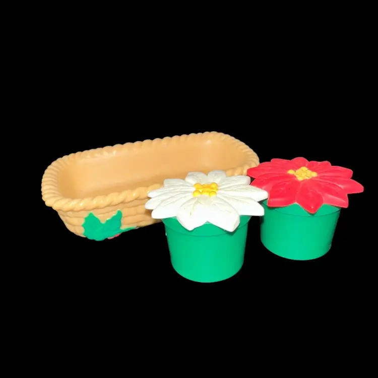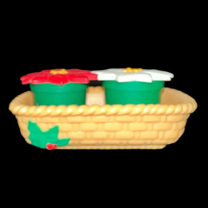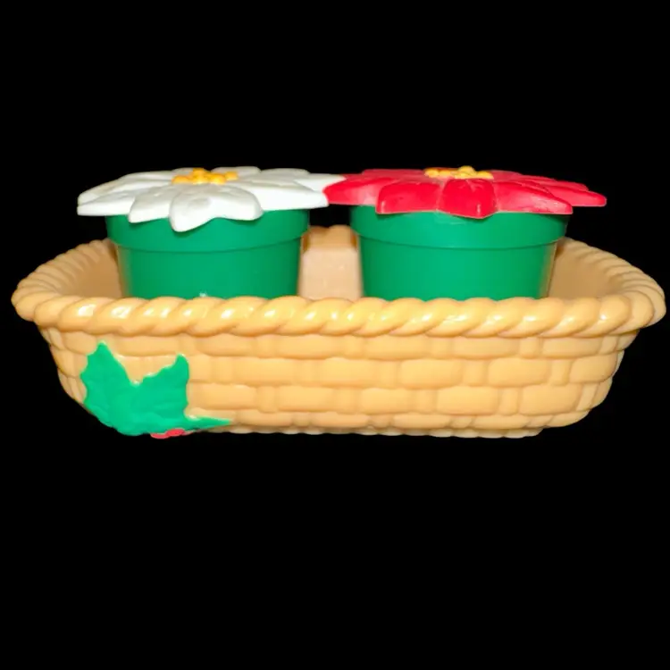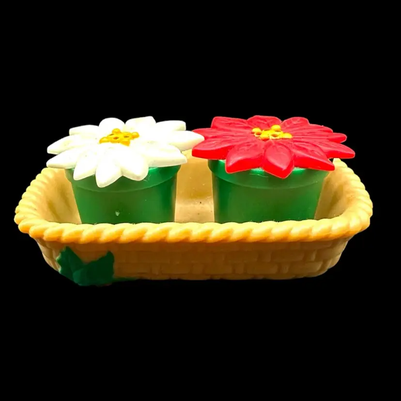 One white poinsettia and one red poinsettia in green pots in a tan basket with a mini holly berry spray. These have never been used. Plastic. Cute set for a holiday table! The poinsettia pots measure about 1.25” tall, the basket measures 3.5” long and 2” wide.