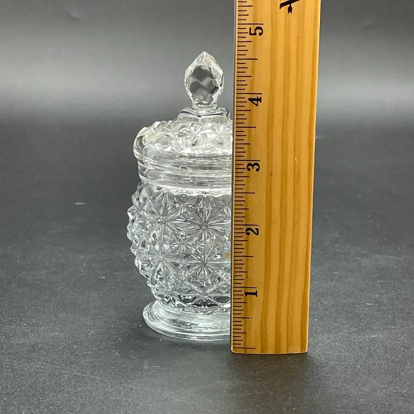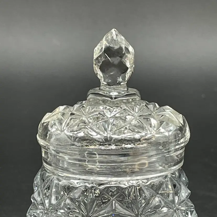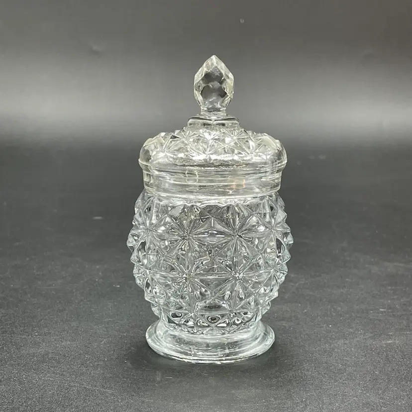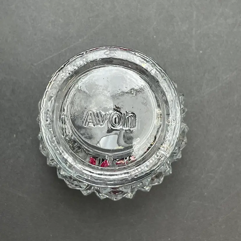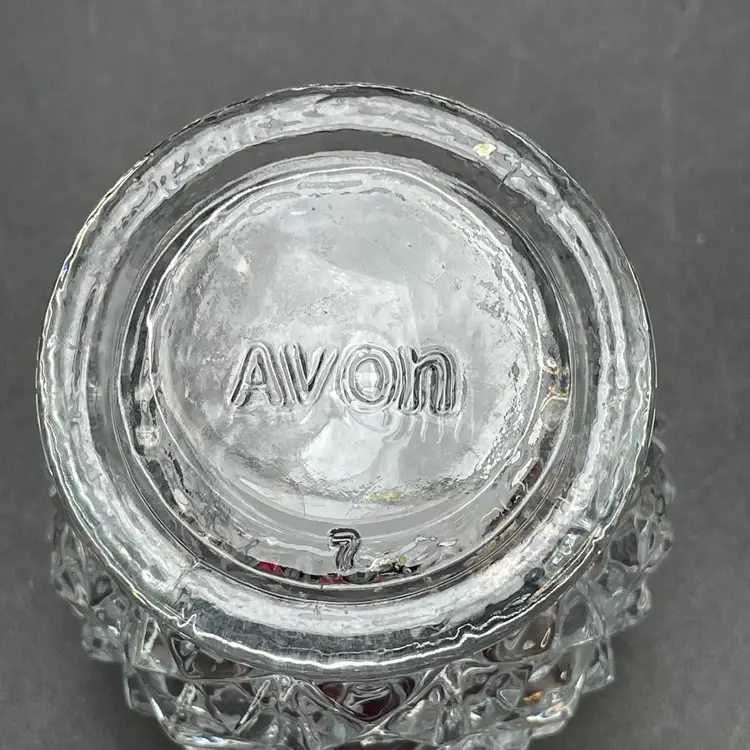 This is a vintage Avon clear pressed glass lidded vanity or jam jar. Marked on the bottom. Measures approximately 4.5" tall including finial x 1.25" across the top. No chips or cracks.