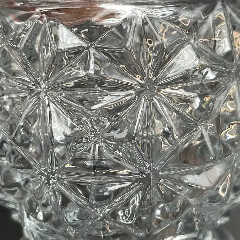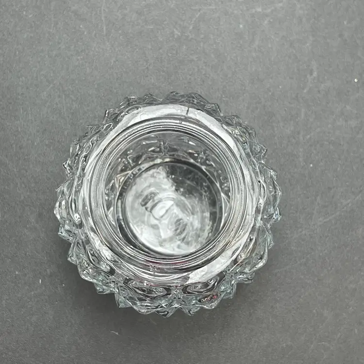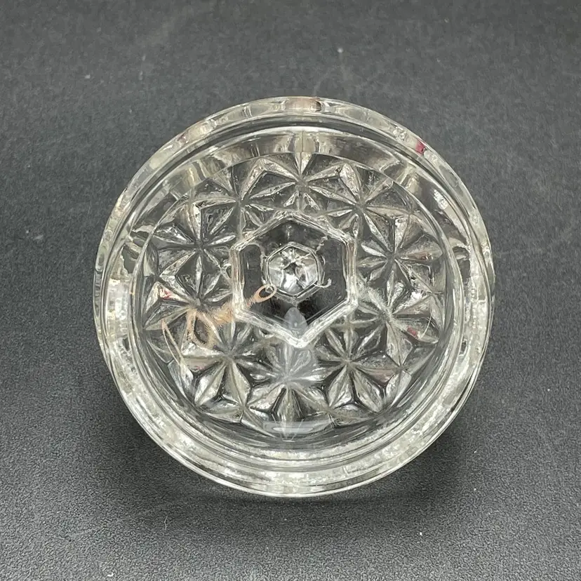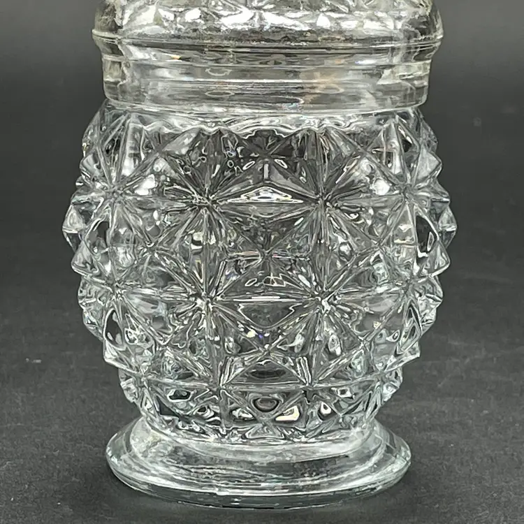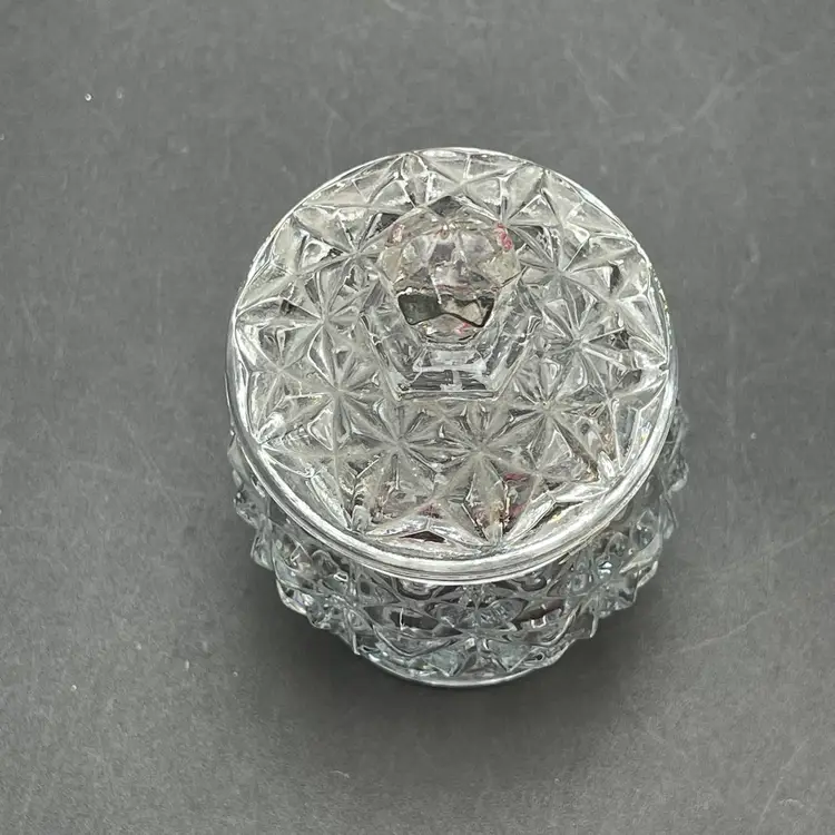 This is a vintage Avon clear pressed glass lidded vanity or jam jar. Marked on the bottom. Measures approximately 4.5" tall including finial x 1.25" across the top. No chips or cracks.