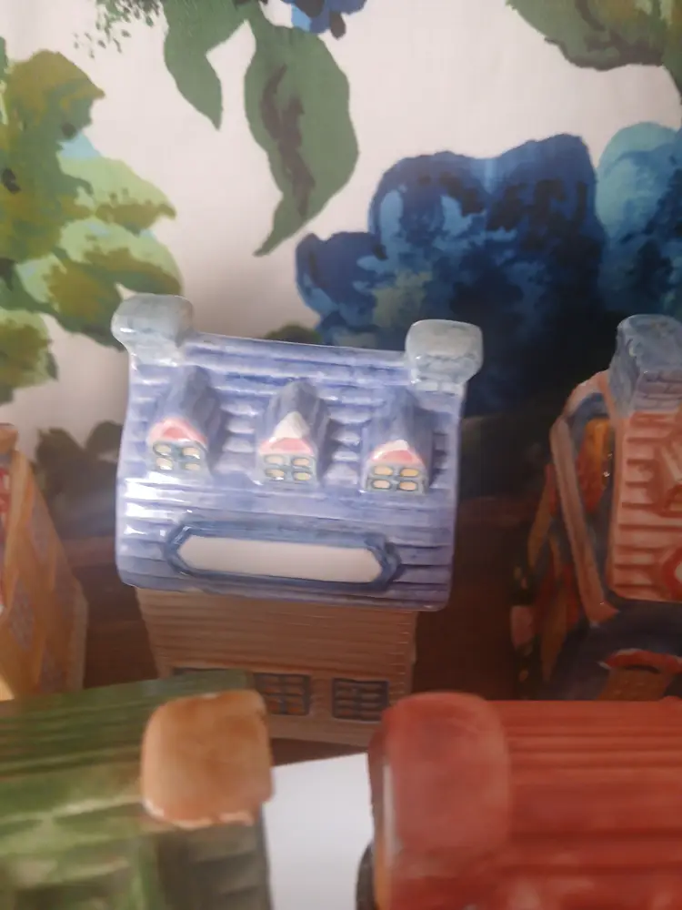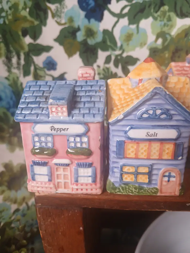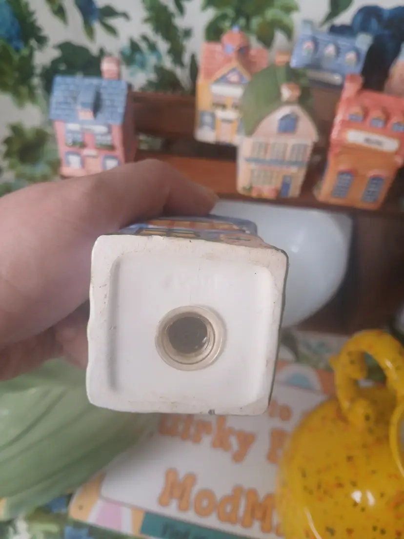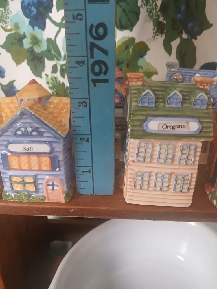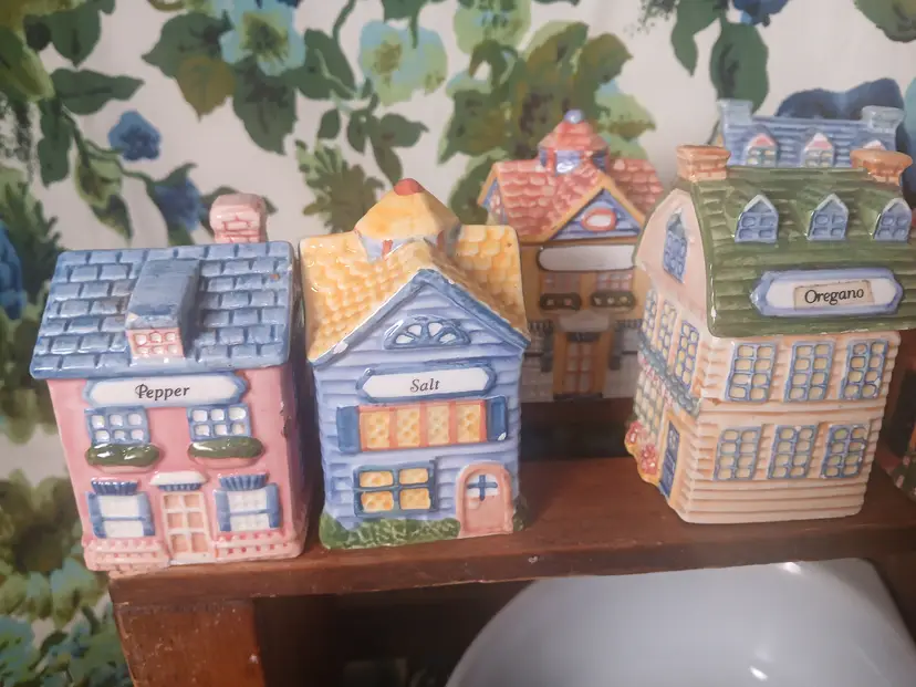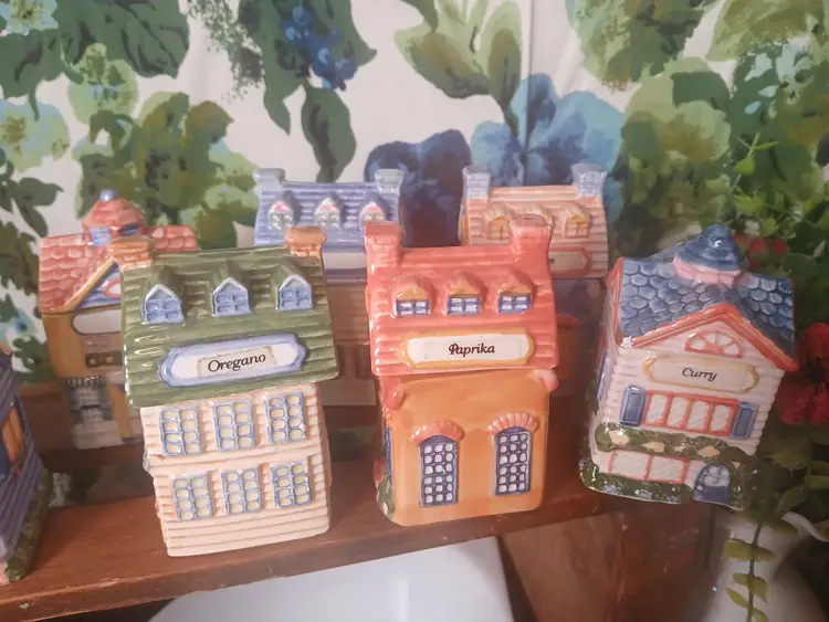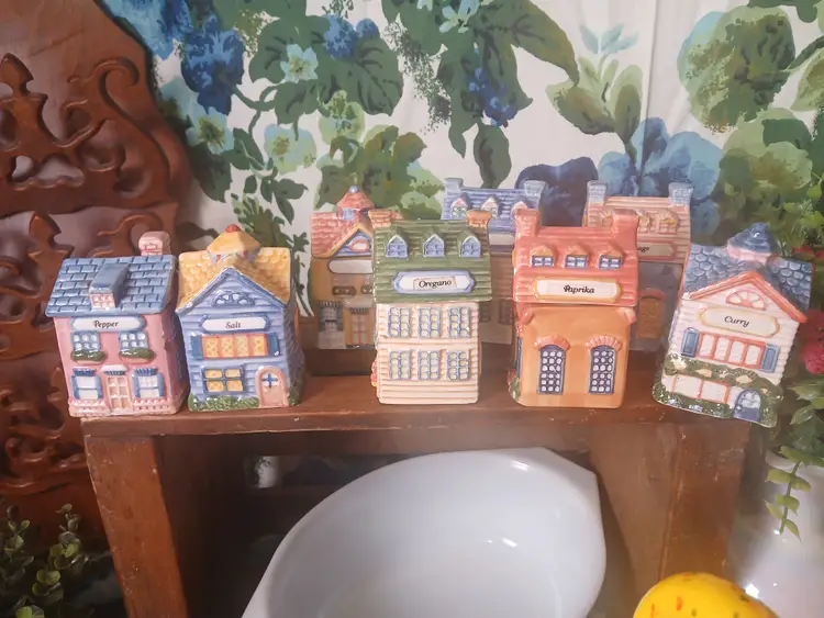 Adorable set of ceramic spice jars shaped like a charming village. Includes jars for Pepper, Salt, Oregano, Paprika, and Curry, and two unlabeled. Perfect for adding a whimsical touch to your kitchen decor. Good condition as shown in the photos. Dimensions are shown as well.