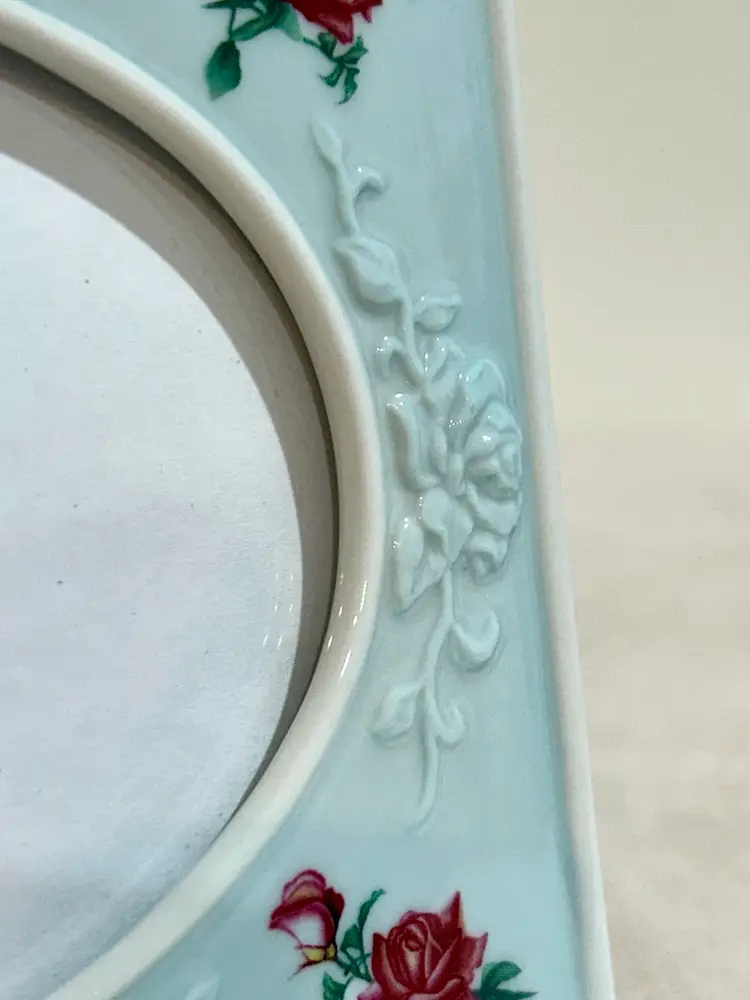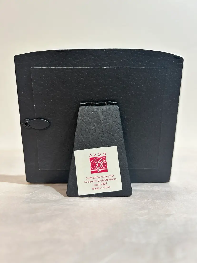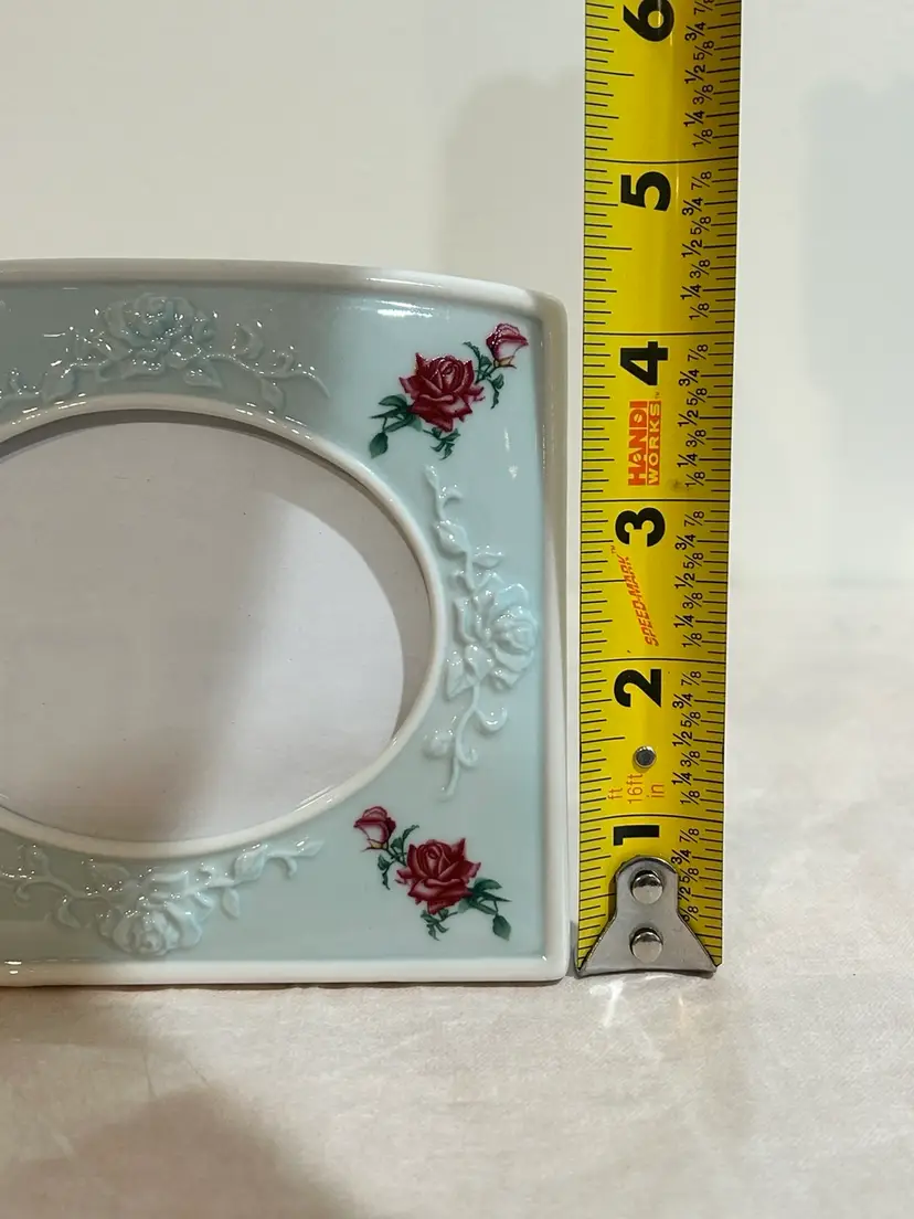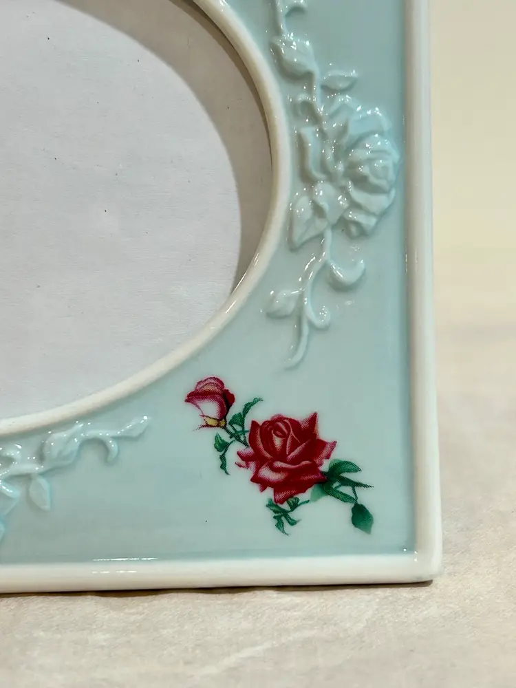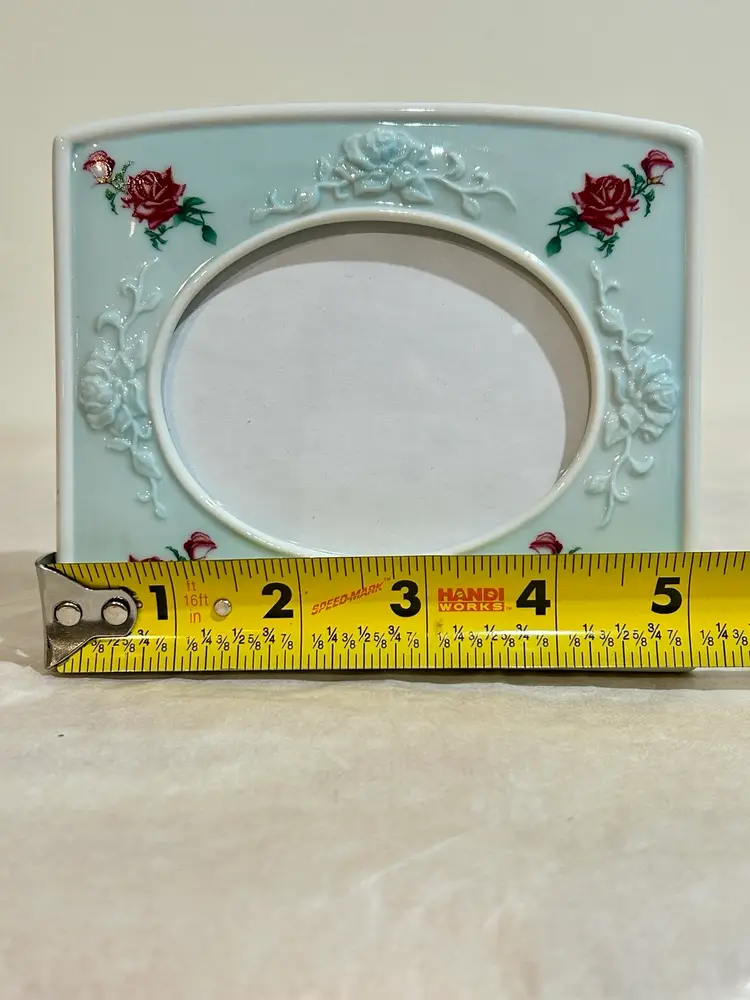 This charming Avon ceramic picture frame features a cottagecore design with embossed flowers and red roses. The frame has a romantic, vintage-inspired look that beautifully complements shabby chic, farmhouse, or cottage décor. A lovely accent for displaying a favorite photo or gifting to a floral or Avon collectible enthusiast. Never used, pet smoke free home. No chips or cracks, very good condition and no paint loss. Frame: 5”Wx4.5”H Oval Photo Insert 3.5”Wx2 5/8”H **Browse my collection of photo frames including chic vintage pieces—you may find the perfect gift or personal treasure.