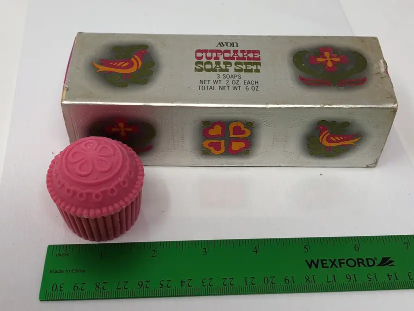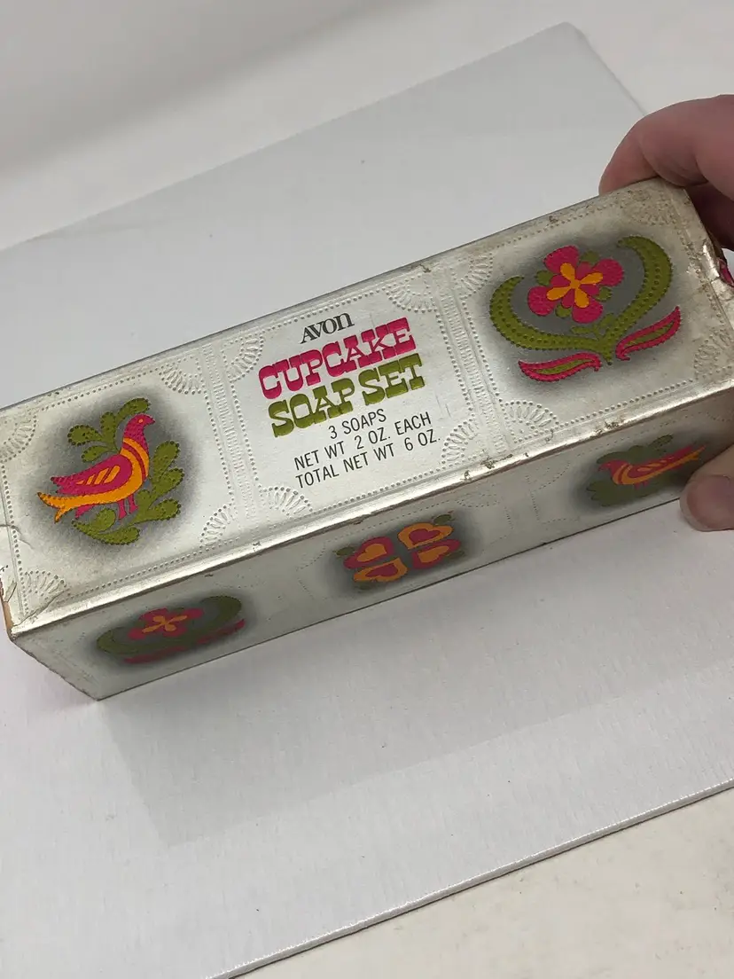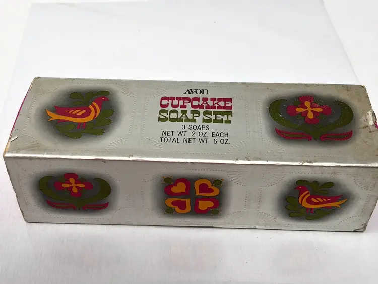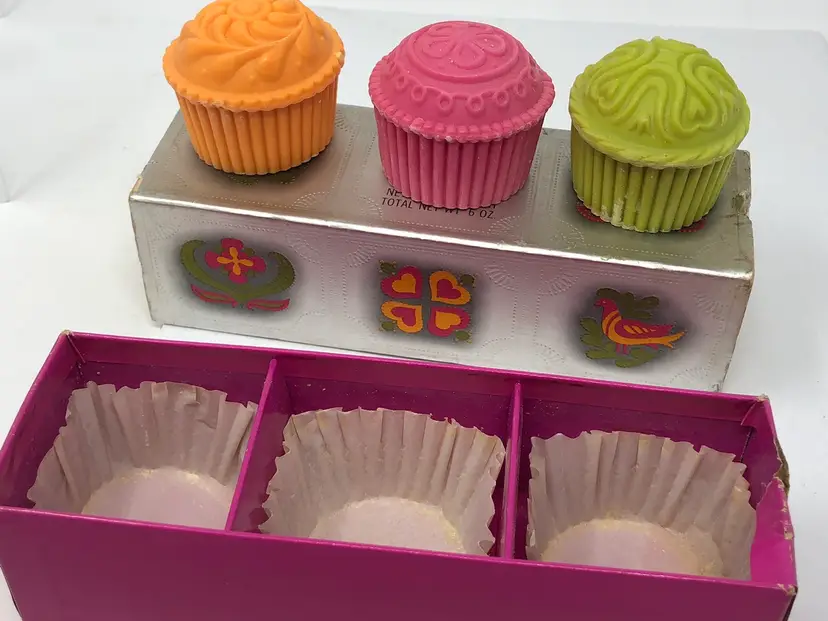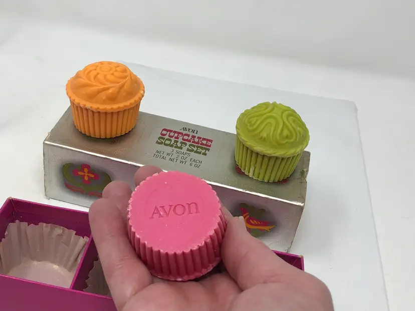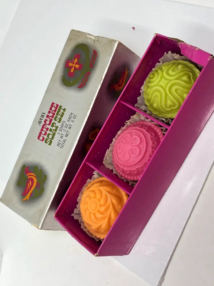 Set of 3 decorative soaps by Avon in original vintage packaging. 1970's set of cupcake-shaped soaps in 3 different colors. Box shows some damage, green pink and orange soaps are in fantastic unused condition and still smell nice.