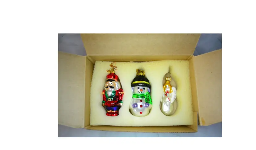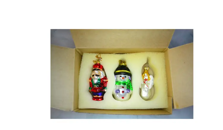 3 glass ornaments by Avon packed in original box which does have wear. Each ornament 3 inches high.