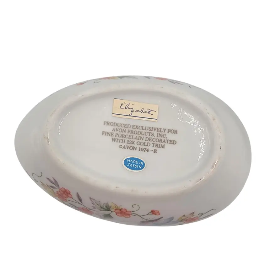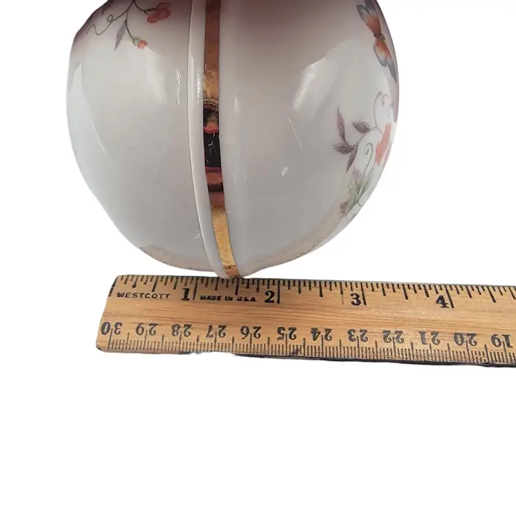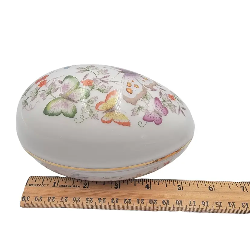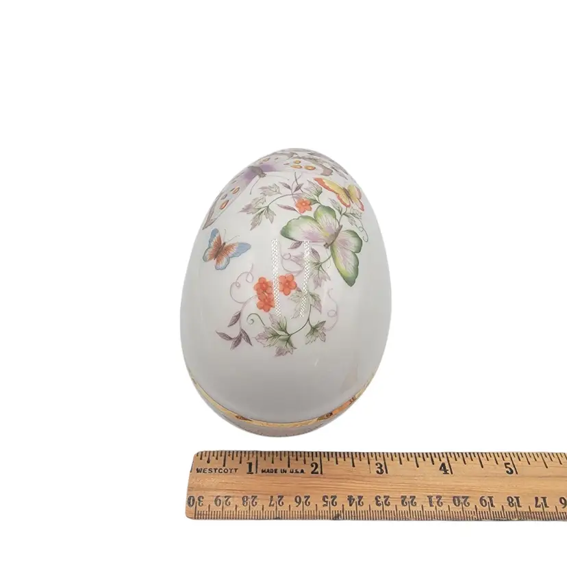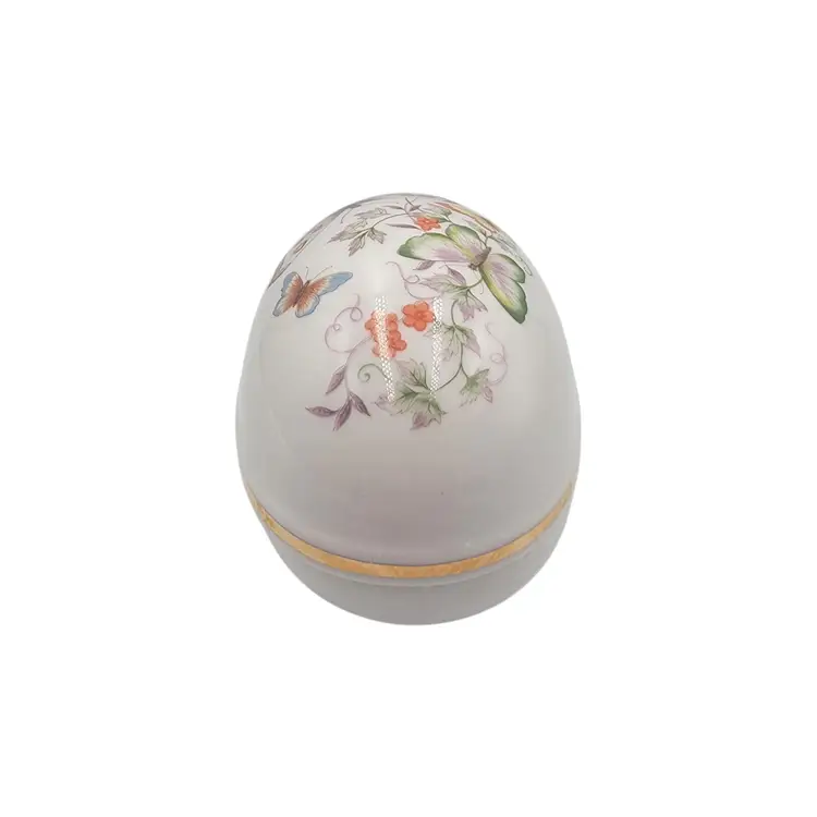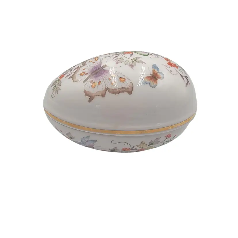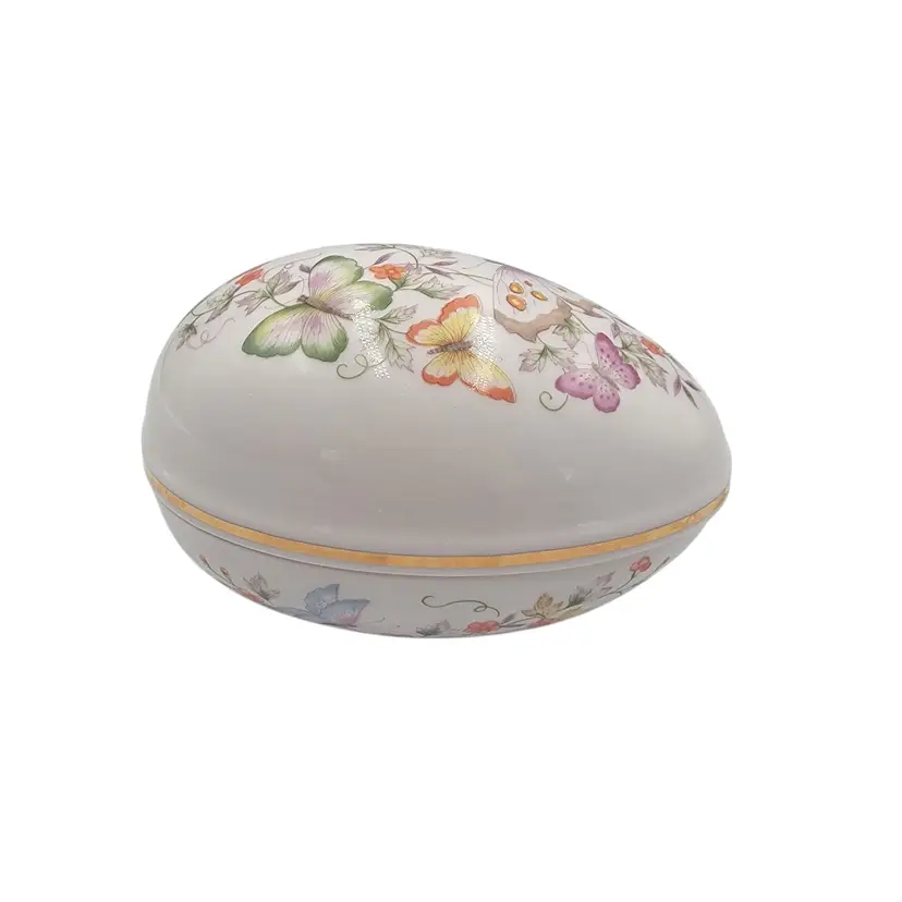 This charming porcelain egg, adorned with delicate butterflies and florals, was crafted in 1974 for Avon. Its 22K gold trim adds a touch of elegance, making it a timeless keepsake. A perfect home for small treasures, this piece combines artistry and functionality, celebrating beauty and craftsmanship.