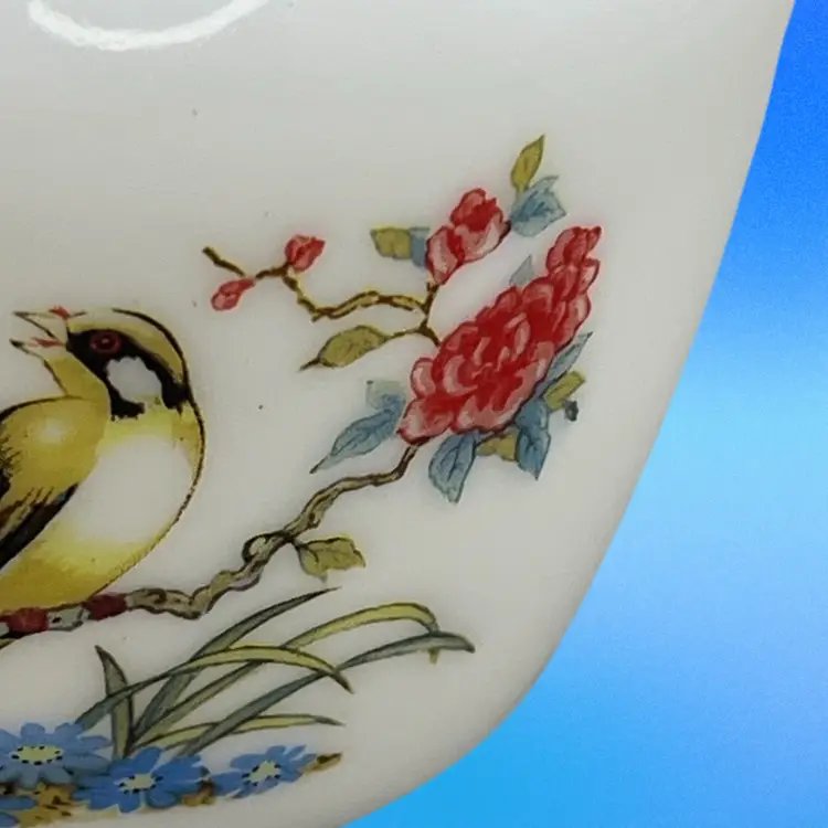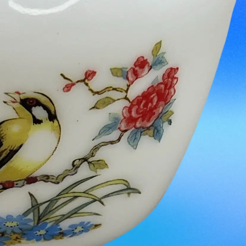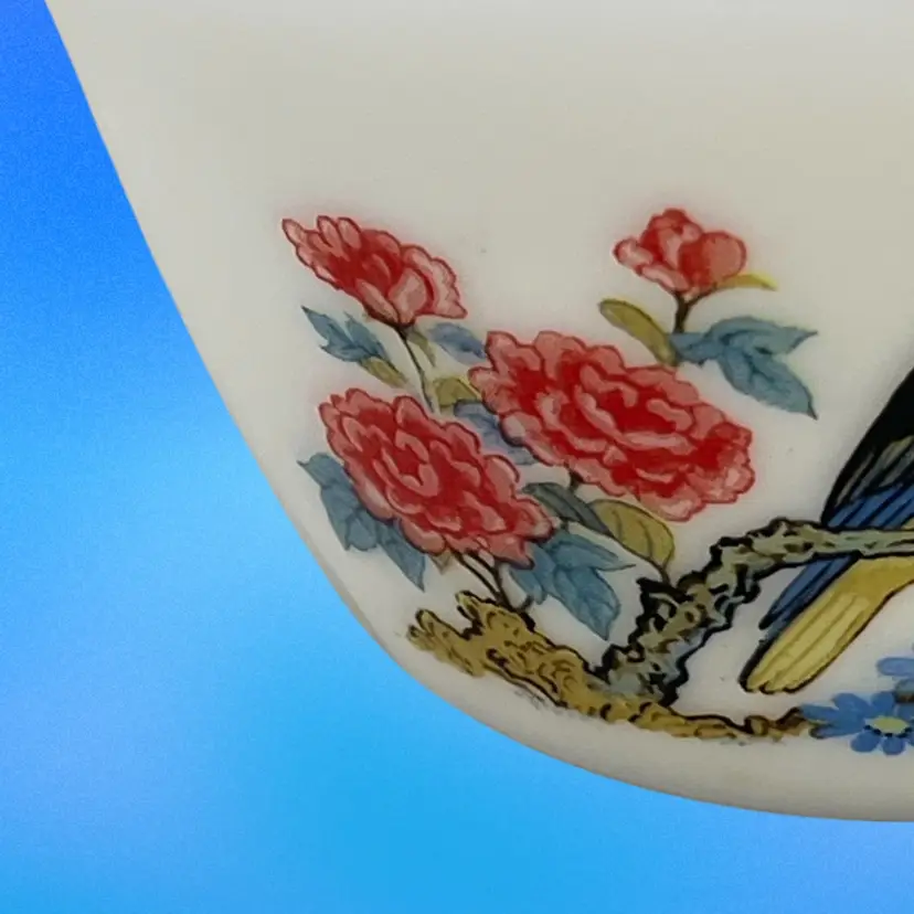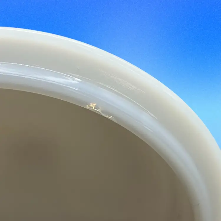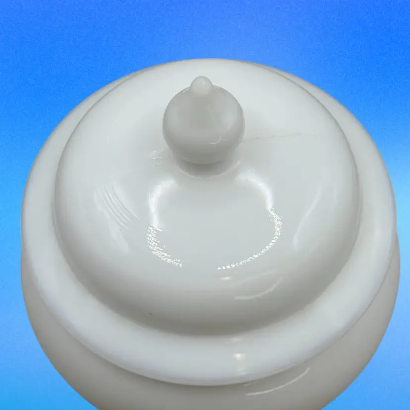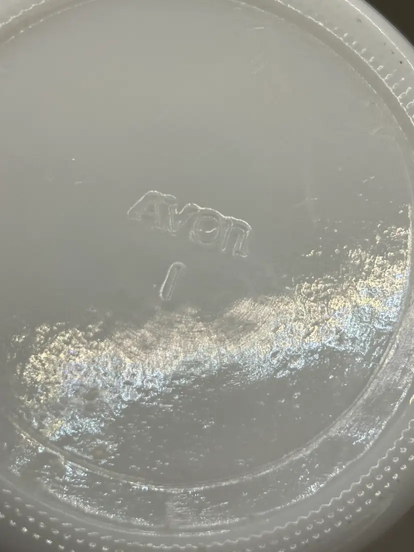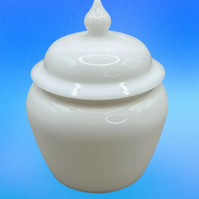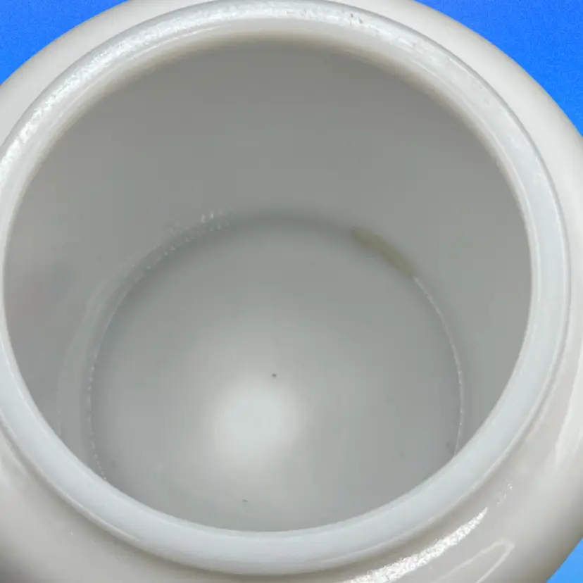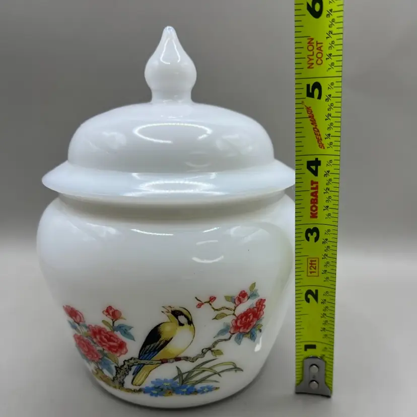 The jar is about 3.5” tall. With the lid it is about 5.5” tall. There are a few small fleabite chips/rough spots on the inner rim of the lid.