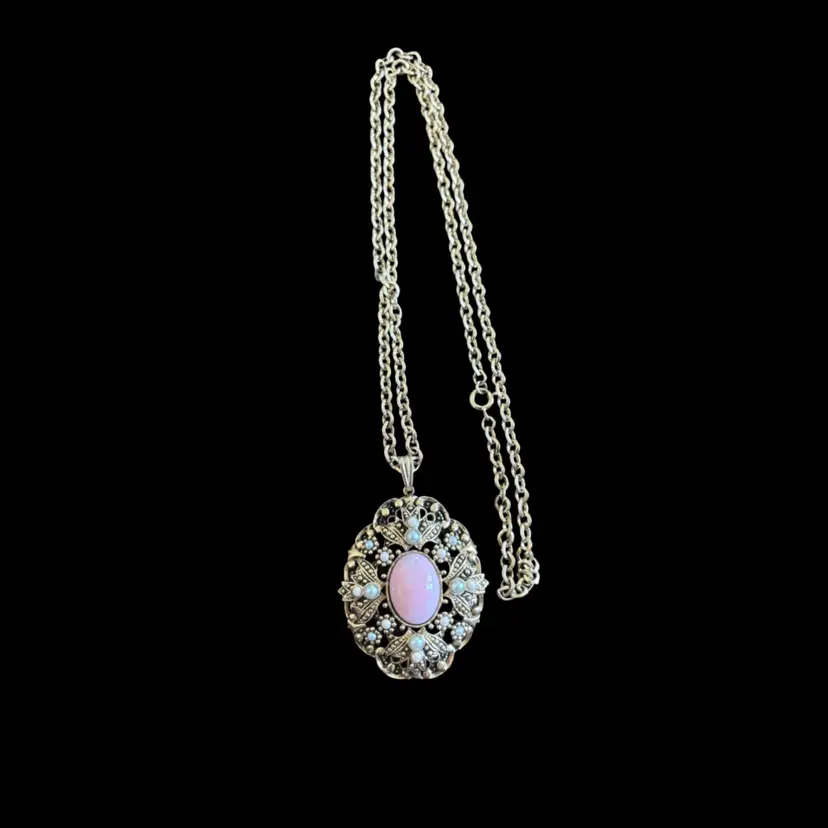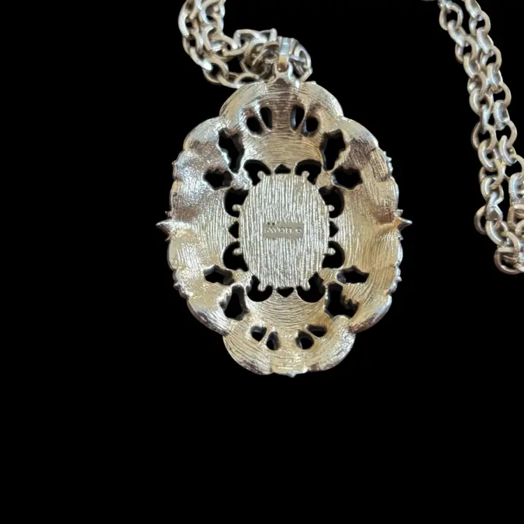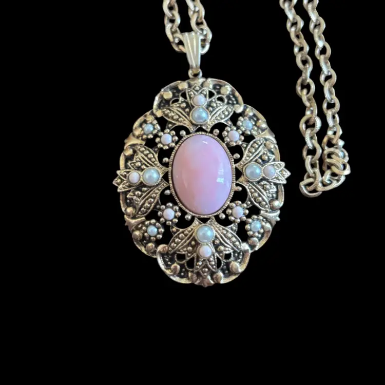 Gold tone, good condition, mild wear to metal 24” chain with 2” pendant