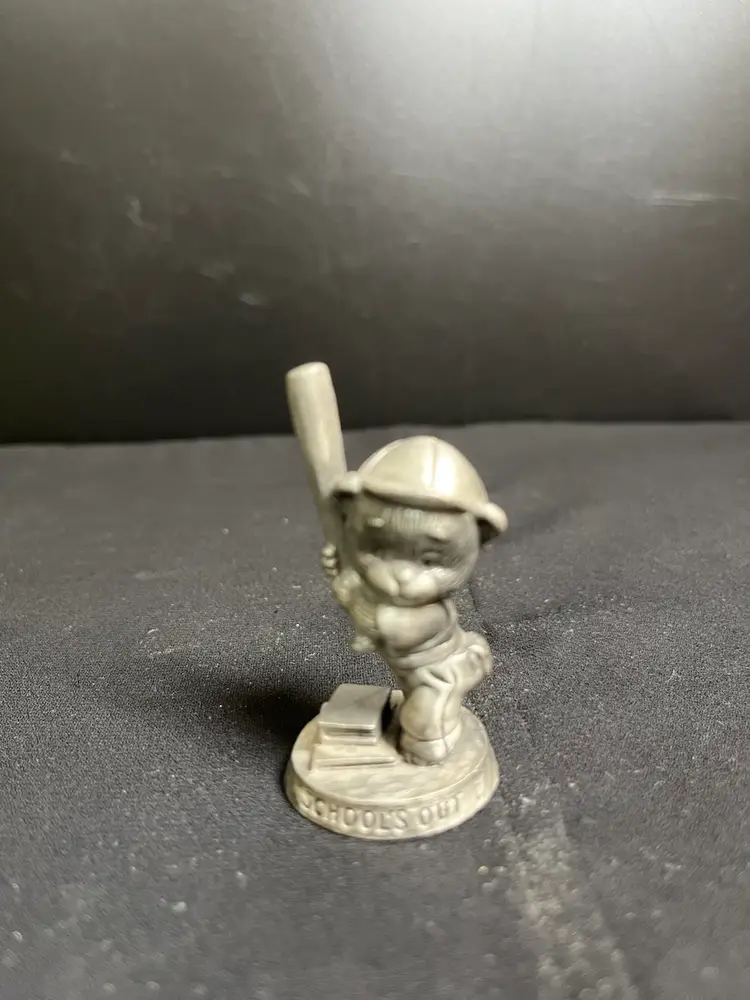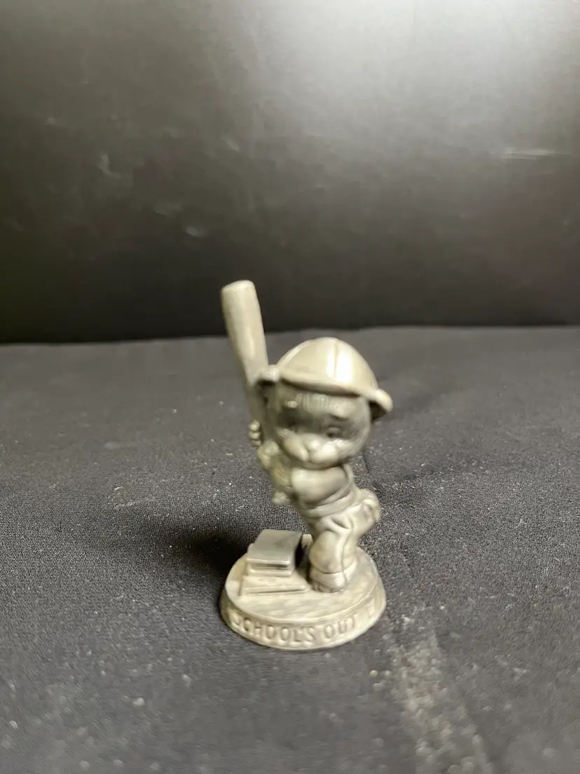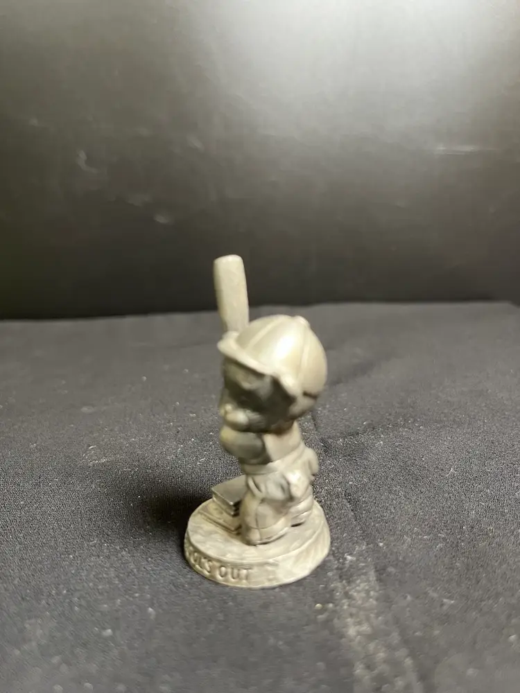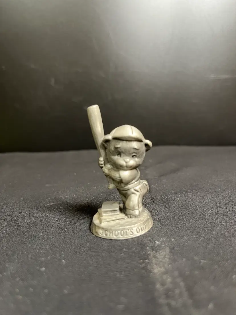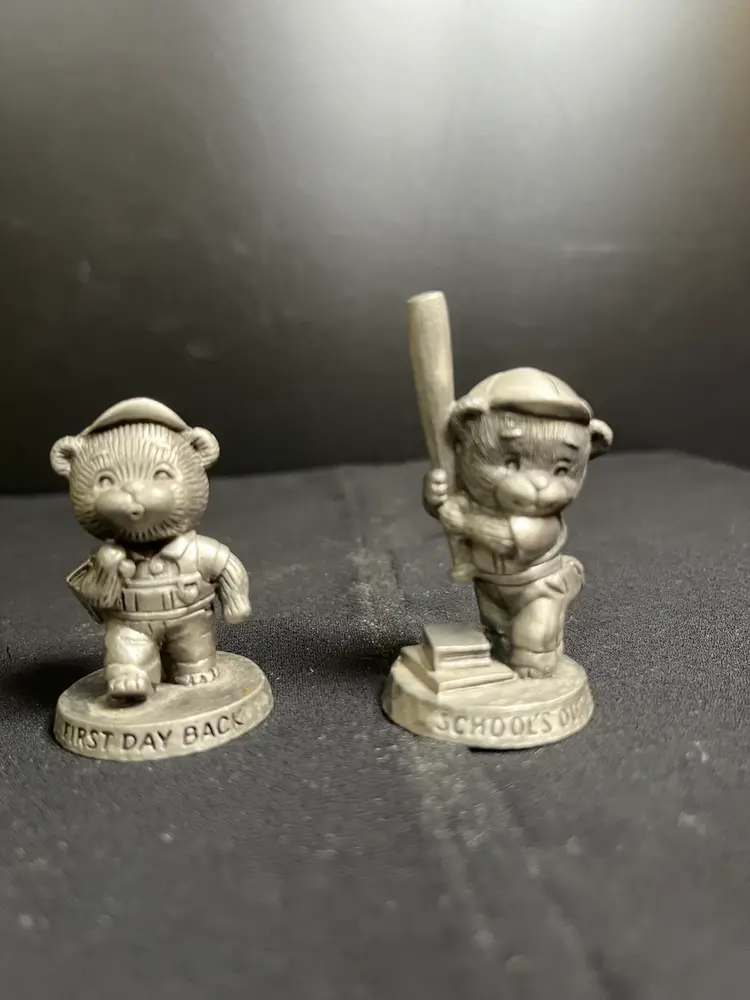Absolutely adorable. There are no call outs on these pewter figurines. Avon is stamped on bottom. Measures approx Batting Bear: 2 1/8"H, 1"W, Strolling Bear: 1.75"H, 1 1/8"W, together weigh 5.1 Oz