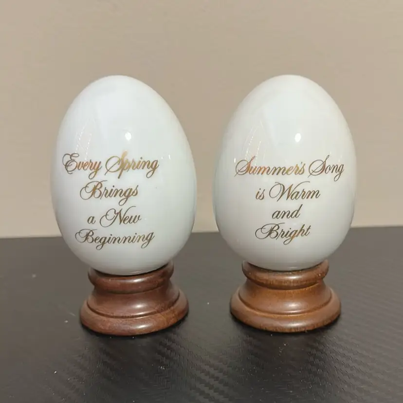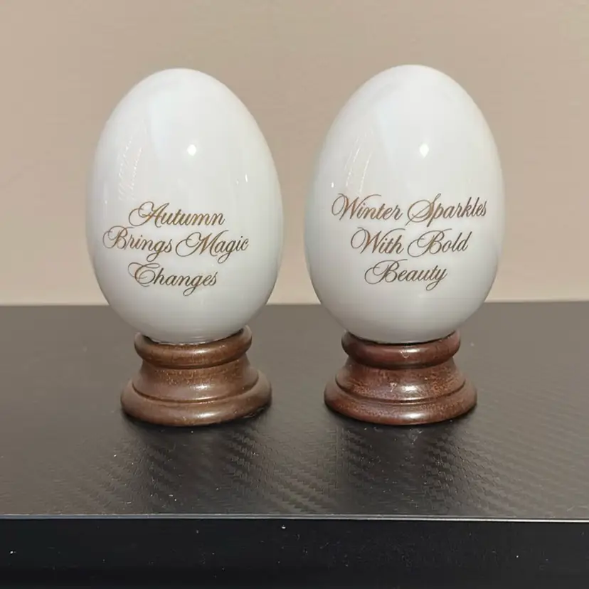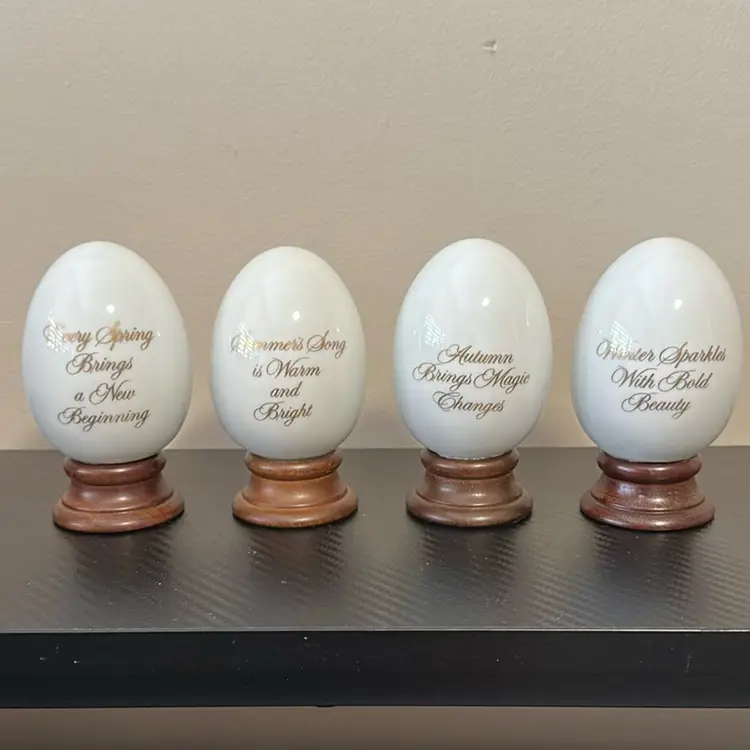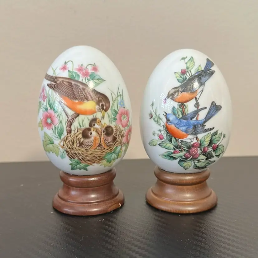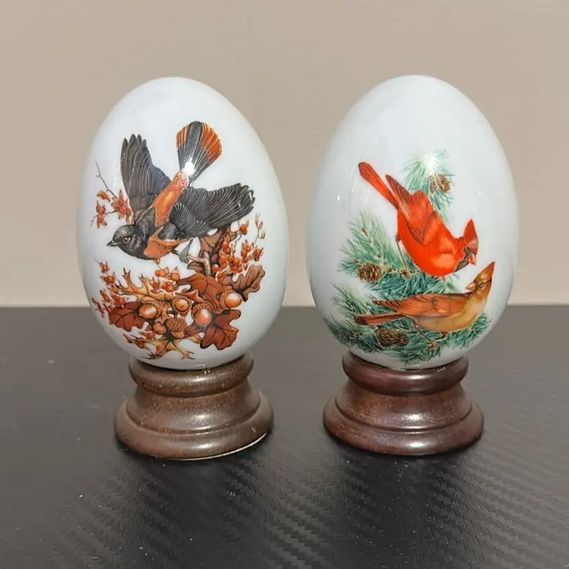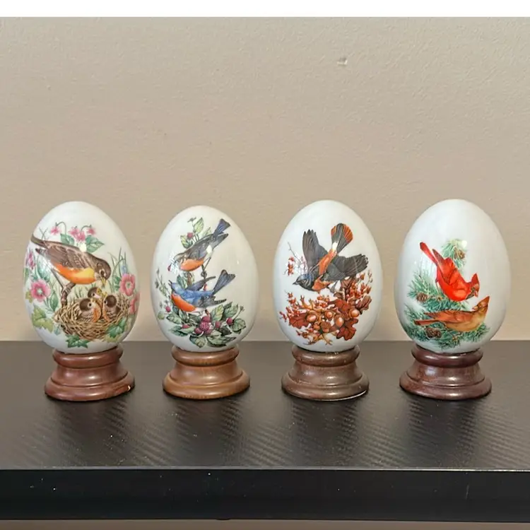 Each just under 4 inches fall and approximately 2.5 inches wide. Eggs are in wonderful condition and one one small nick on wood base, see photo.