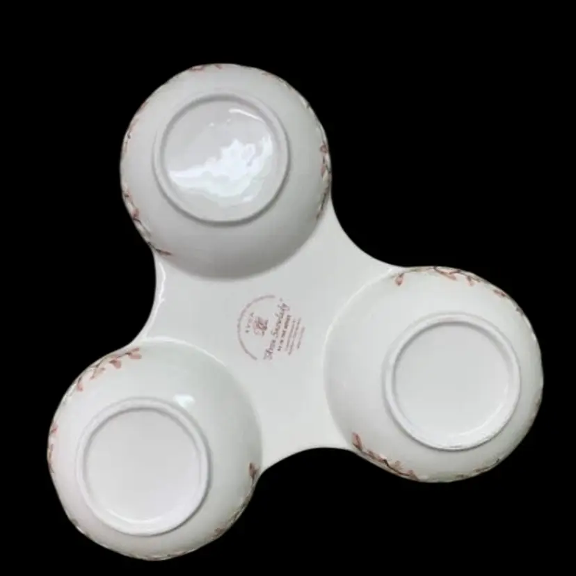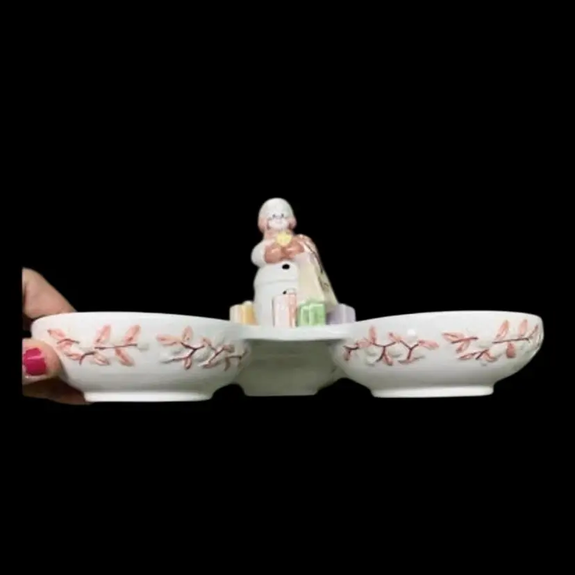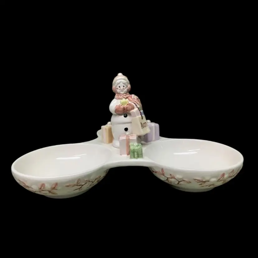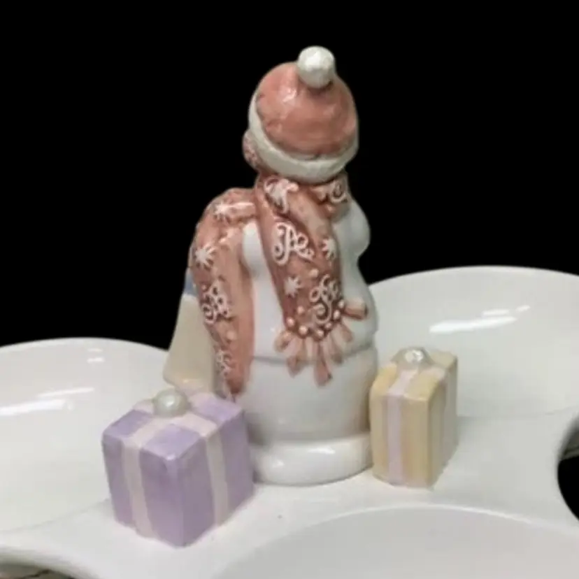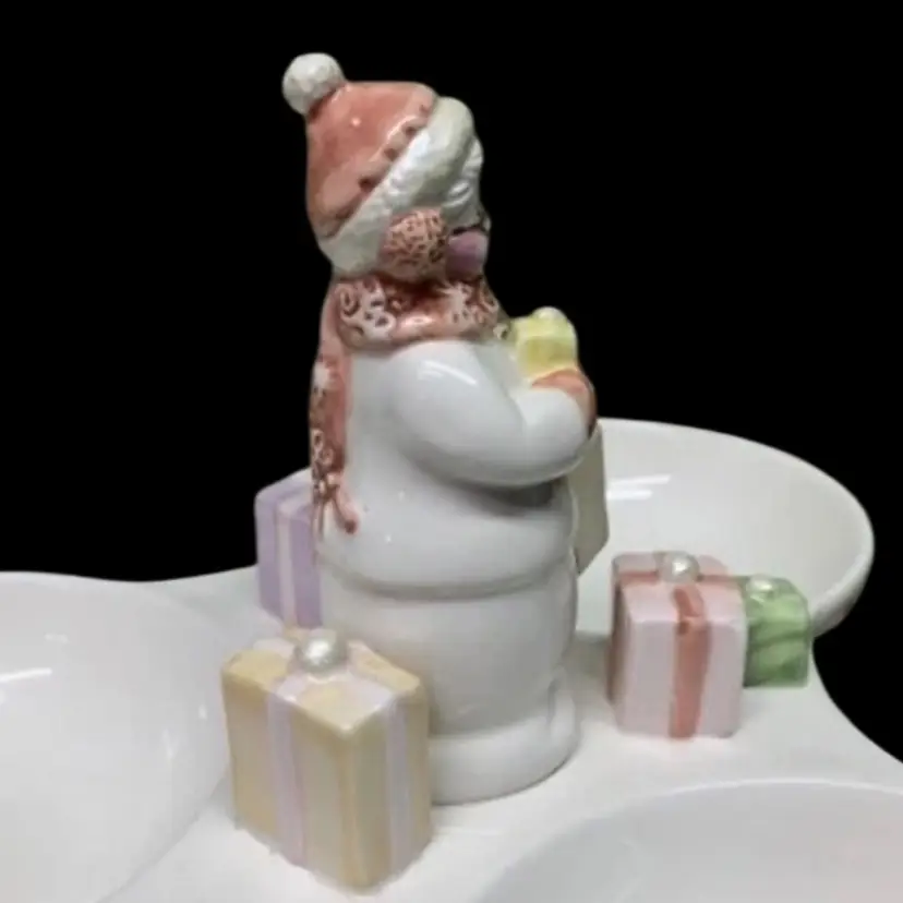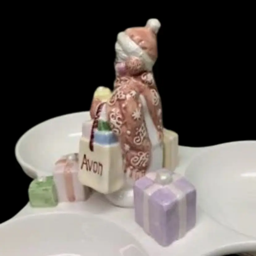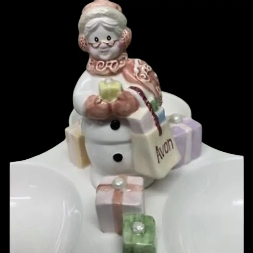 AVON SNOWLADY 3 SECTION SERVER CONDIMENT TRAY 2003 PRESIDENT’S CLUB HOLIDAY GIFT. ADORABLE!!!! No chips, cracks or crazing 10 1/4” x 10 1/4” Each little bowl measures 4 1/4” in diameter x 1 1/2” deep