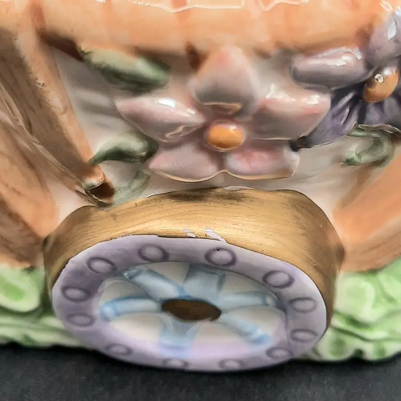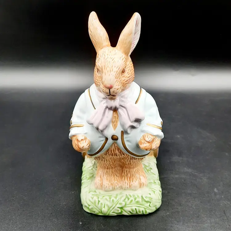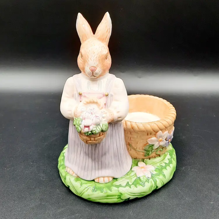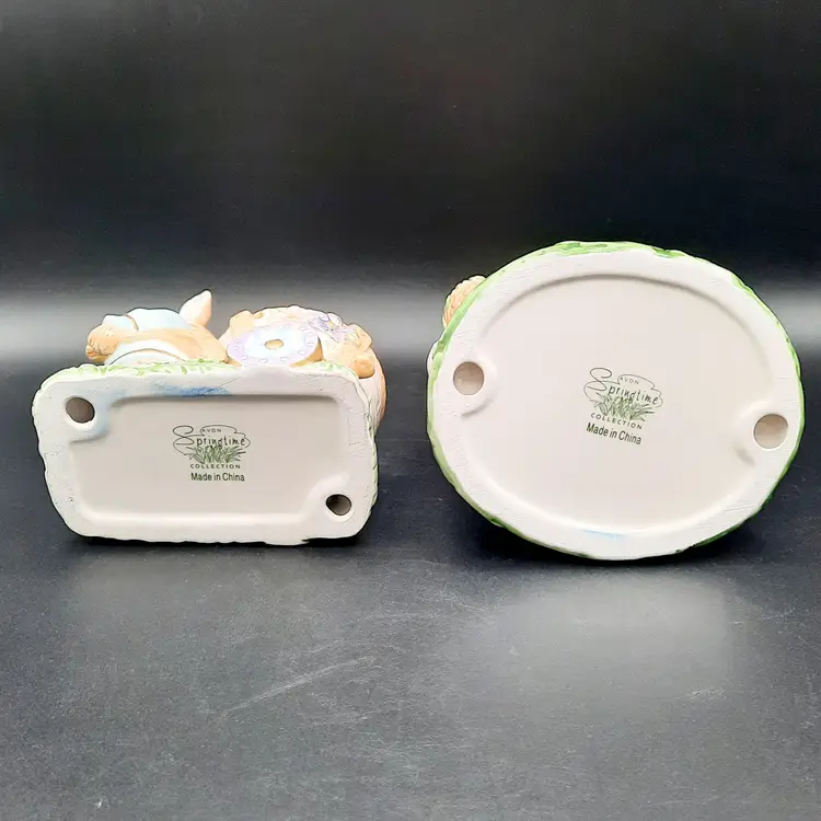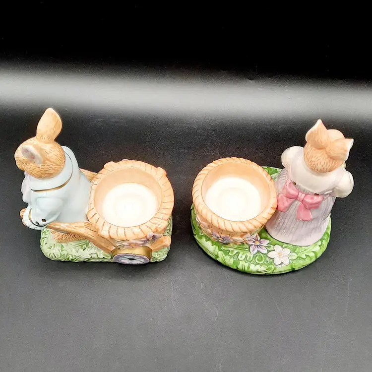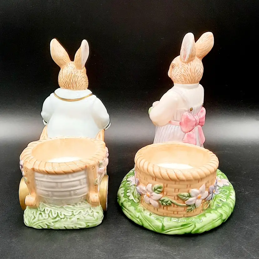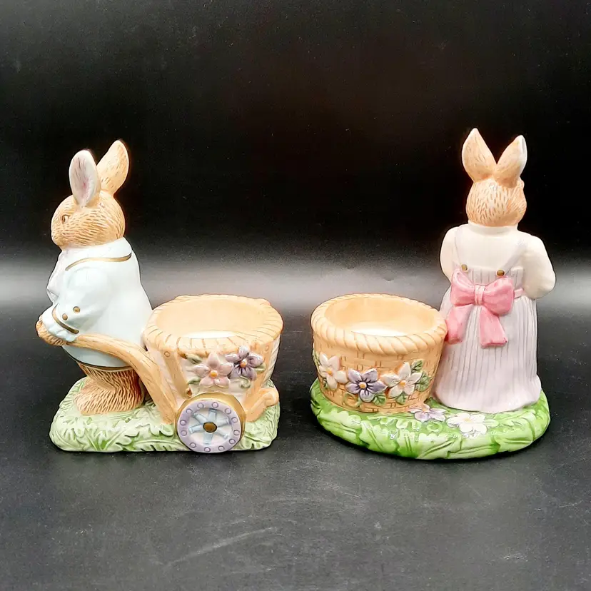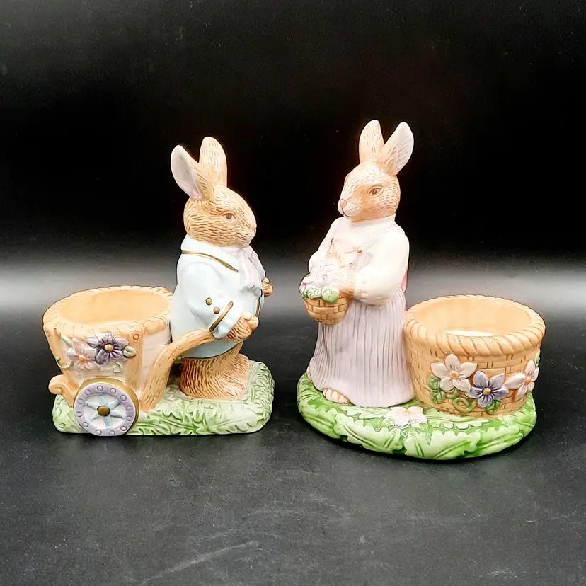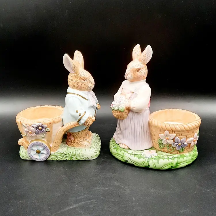 Mr Rabbit is 5 1/2"H x 4"L x 3"W, Mrs Rabbit is 6"H x 4 1/2"L x 4"W, great condition with a few small paint chips on wheel of Mr Rabbit's wheelbarrow