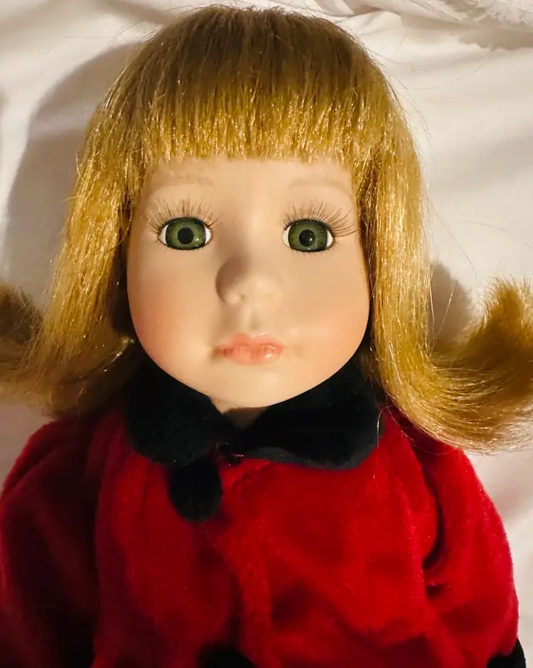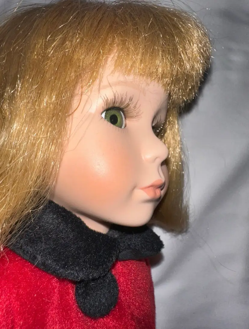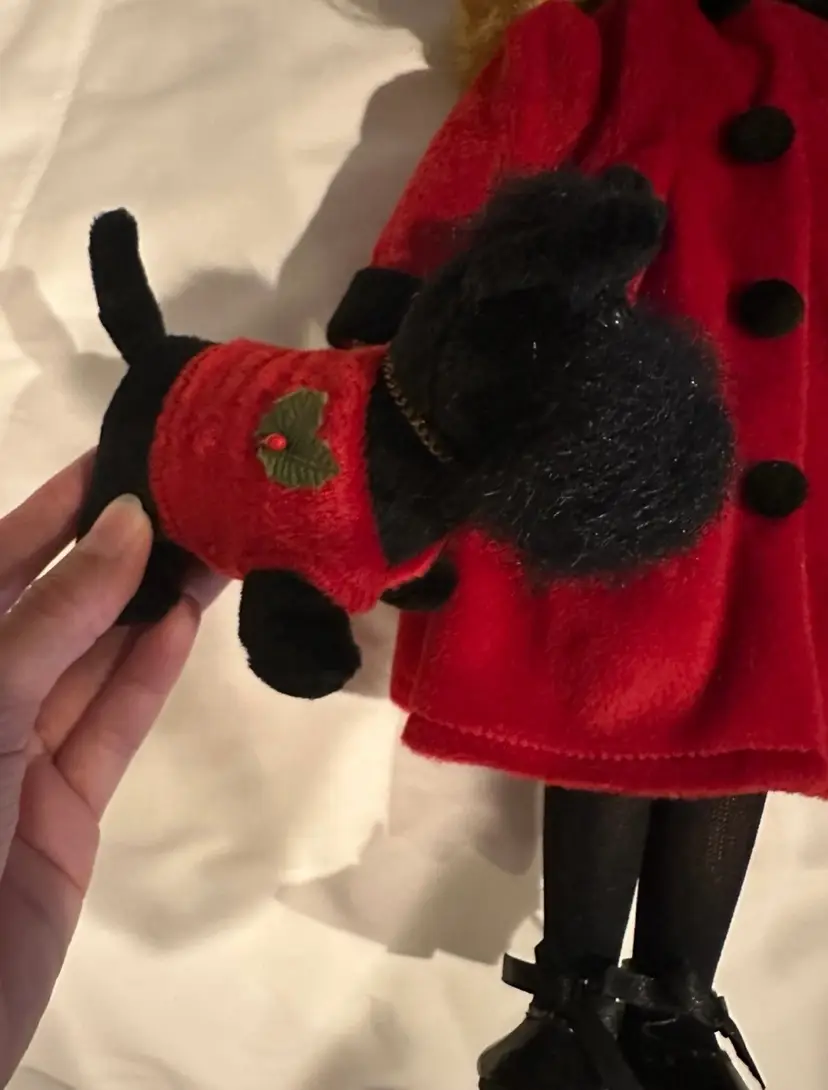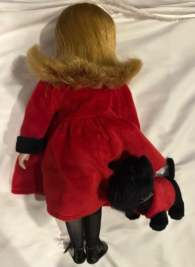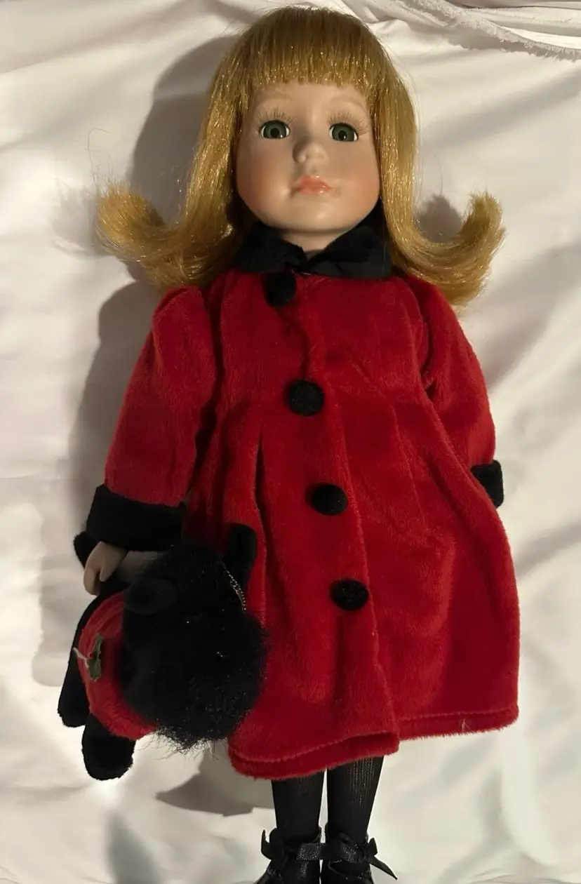 AVON Winter Holiday Porcelain Doll with the Scotty Dog. She’s got beautiful red coat and Scotty has the matching outfit too. It is approx about 15” tall.