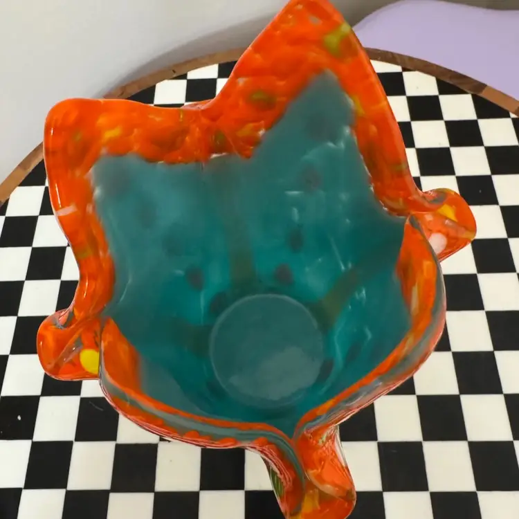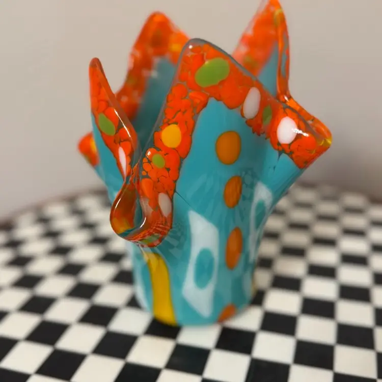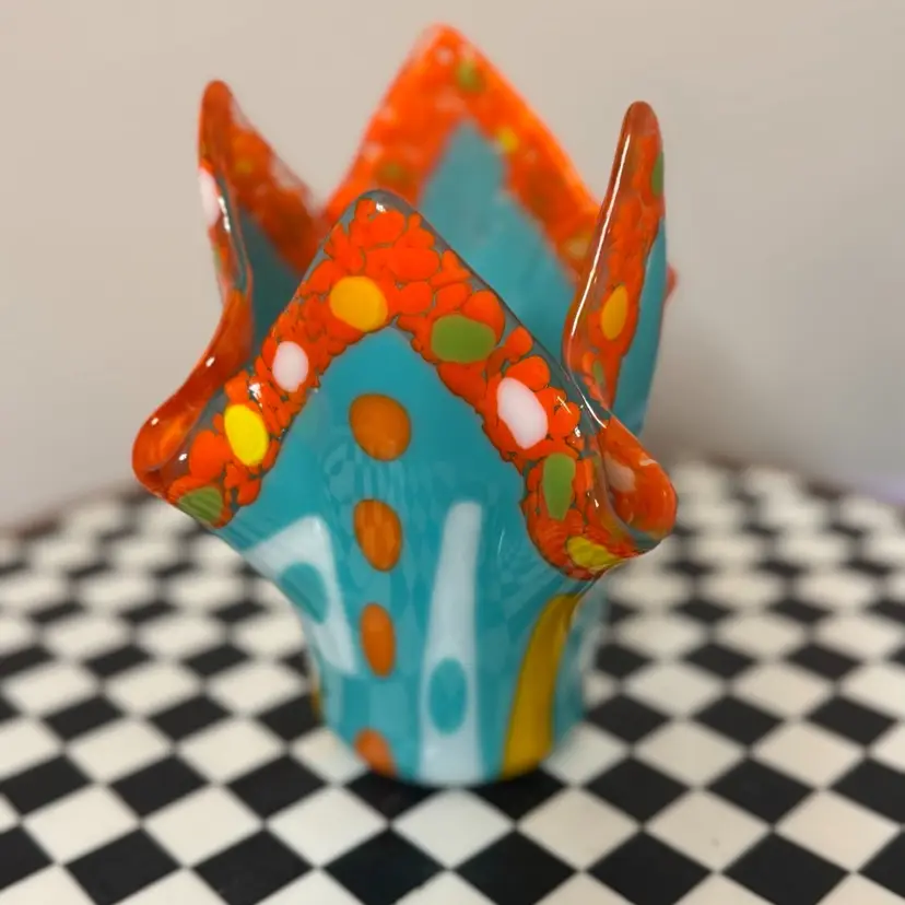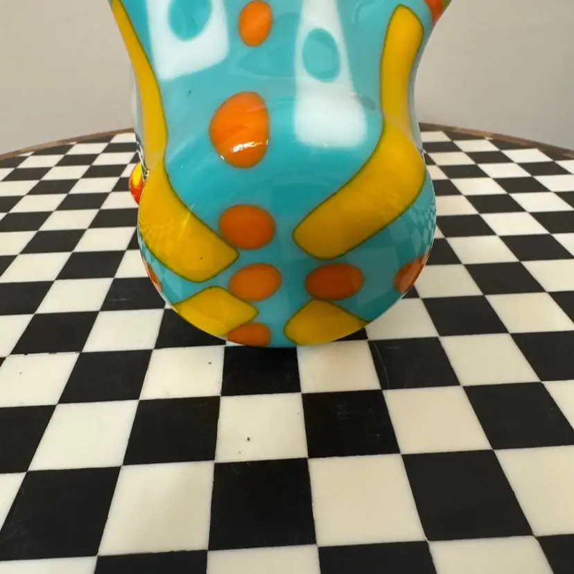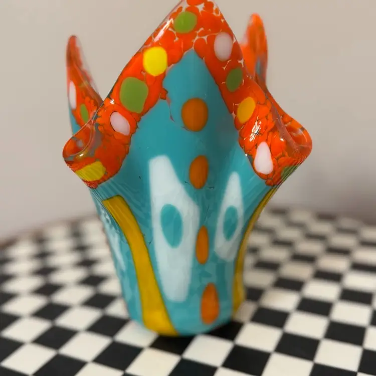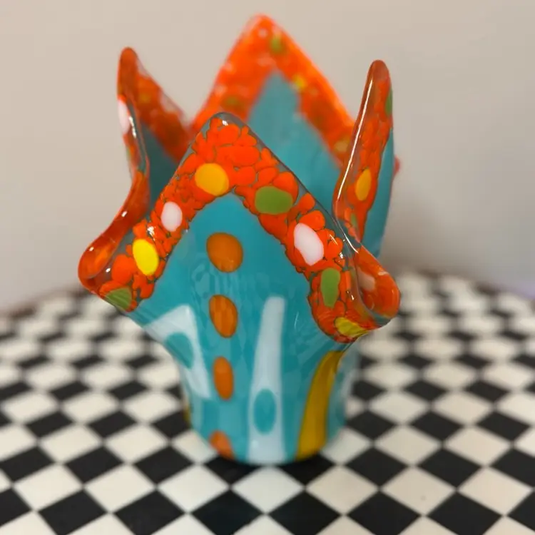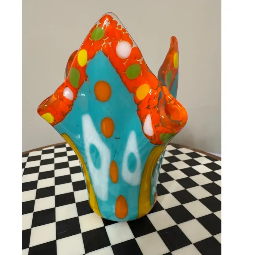 Beautiful colors and design! Excellent condition. Can be used for a vase or candle holder. Measures about 6 1/2 inches tall by about 7 inches across.