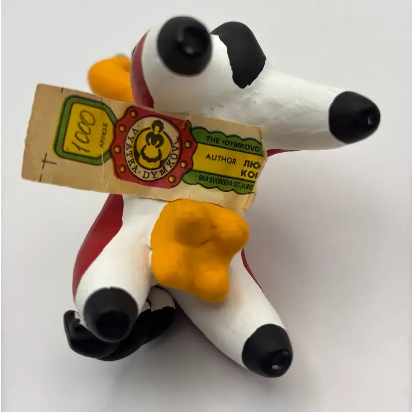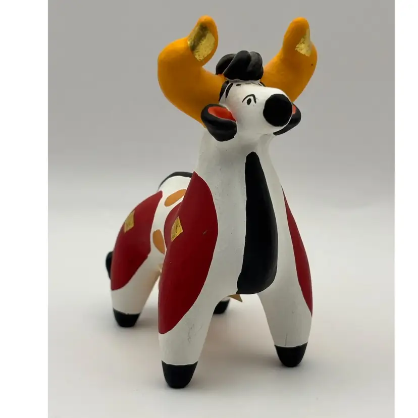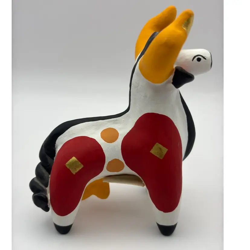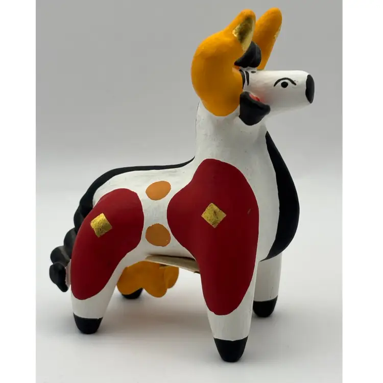 I love the contrasting colors on this (cow?) These clay figures are handmade and unique. Made mostly by women in the village of Dymkovo, they are hand formed, dried in the open air, fired in an oven or kin, whitewashed with a solution of chalk and skimmed milk and painted with colorful distemper eggs yolk paints. No chips or cracks About 4-1/2” tall and 4” long (🌟Check out my listings for more availability in this collection)